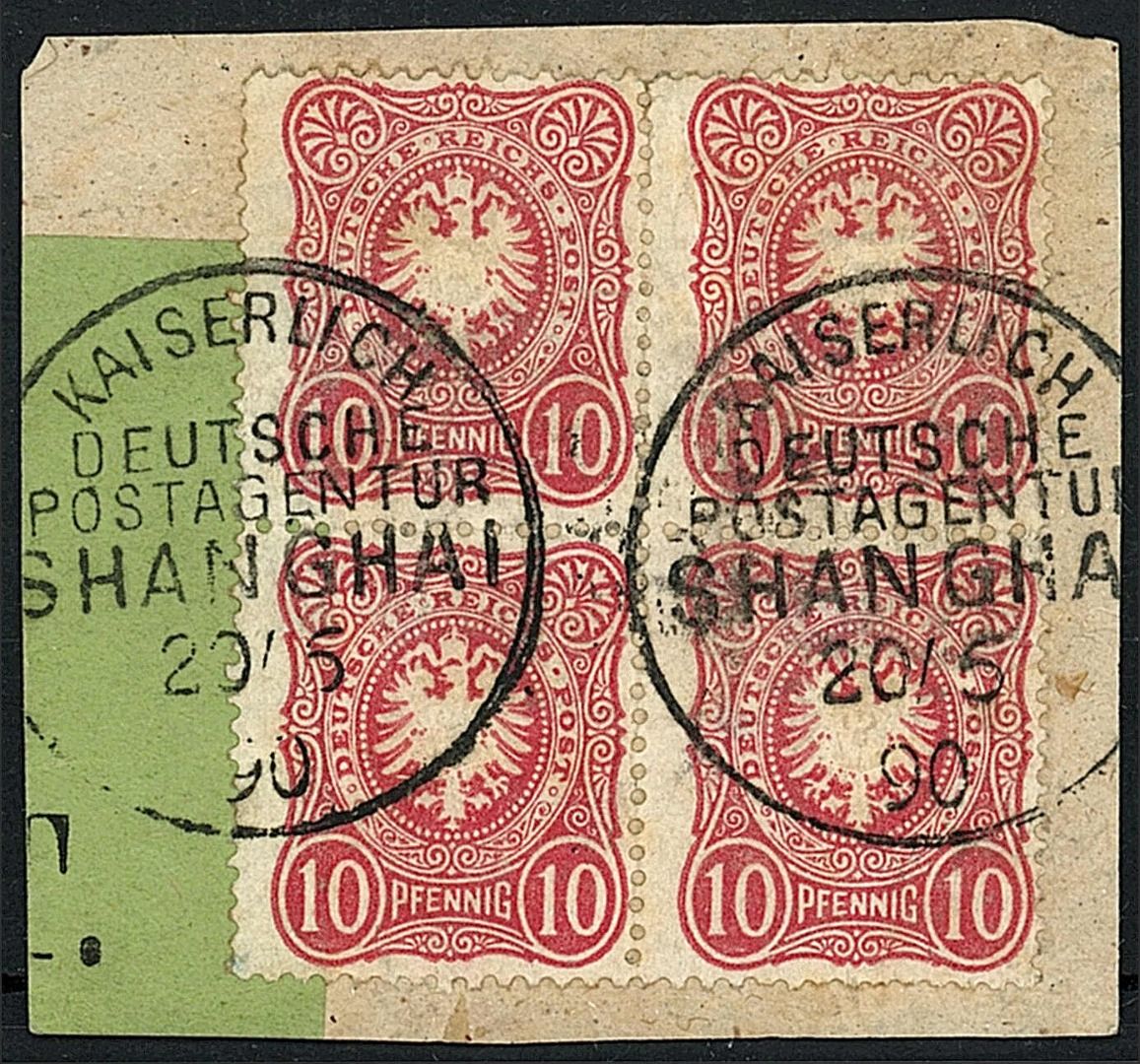 10 Pf. Innendienst Ziffern im Oval (Vorläufer V) 1886/1889, vier Werte gestempelt als Viererblock auf Briefstück, jeder Wert geprüft Pfenninger. ME. 400,-€