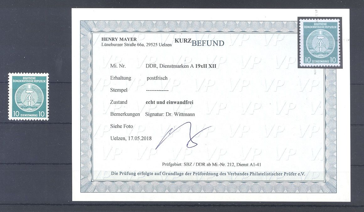 DDR Dienst Michel Nummer 19 xII / XII, 10 Pfg. Freimarke 1954/56 in der guten Type ** in sehr guter Erhaltung. Es liegt ein Befund VP vor, ist mit eingescannt.