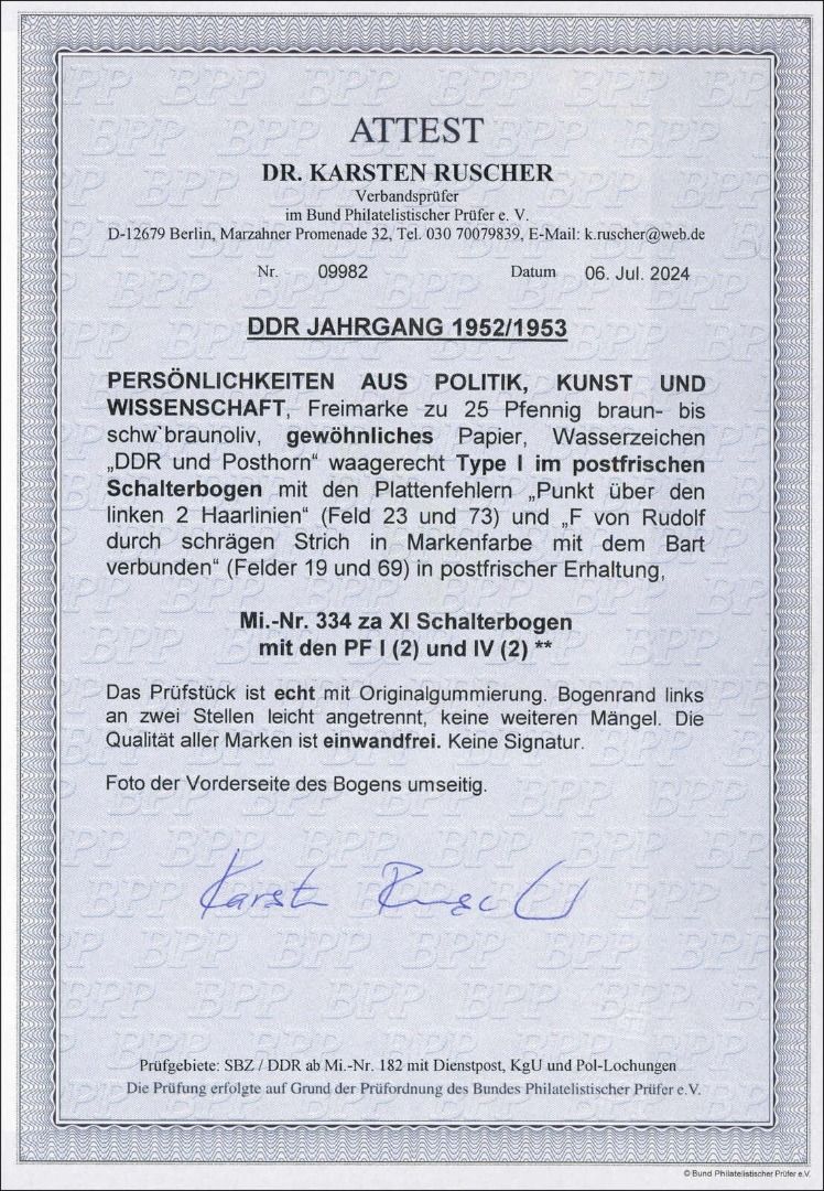 DDR Mi 334zaXI** (100) mit PF II (2) und IV (2), einwandfreie Qualität, mit FFA Ruscher BPP