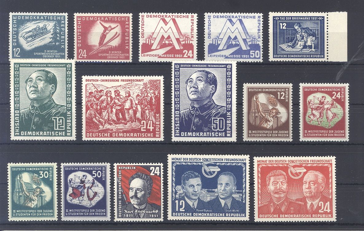 DDR Michel Nummer 280/97, der Jahrgang 1951 fast komplett **, die billigen Michel Nummer 291/92 haben ein leichteren Farbabklatsch rückseitig, sonst ordentlich.