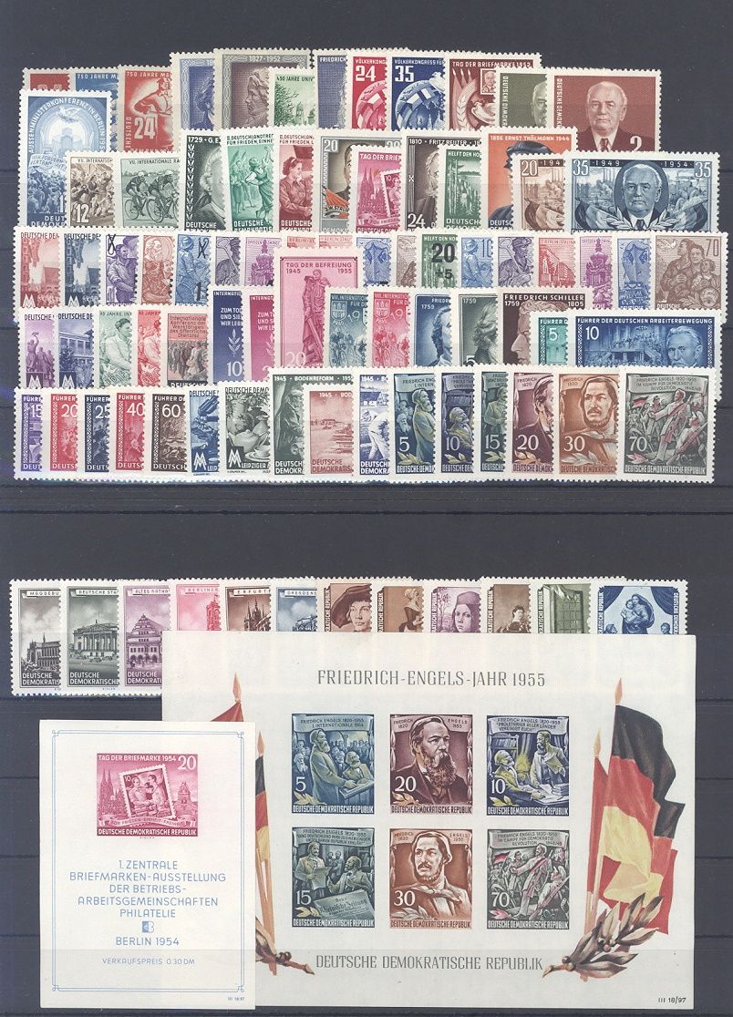 DDR, umfangreicher */** Posten aus den Jahren 1950/55 auf zwei Steckkarten, dabei auch die Jahre 1954/55 bis auf zwei Blöcke wohl in den Hauptnummern komplett. Sollte sicherlich nicht teuer sein...