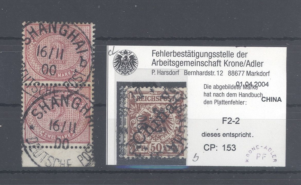 Deutsche Post China, zwei schöne Besonderheiten als Posten mit einem etwas stockigen Vorläufer Paar mit aber wunderbaren Stempeln und einem Plattenfehler. Nett!