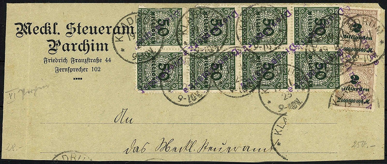 50 Mio M. + 2 Mrd. M. Freimarken 1923, schöner Briefabschnitt mit D.R. Schutzaufdrucke der Mecklenburgischen Landessteuerdirektion auf Freimarken Ausgaben Mi.-Nr. 32 in senkrechtem Achterblock und Nr. 37 A in senkrechtem Paar je mit violettem Aufdruck ,,DIENSTMARKE" (Type VI Parchim), zeitgerechte Entwertung von ,,KLADRUM * * 19.11.23 9-10 V". Die Marken tragen geringe Verfärbungen und sind teilweise von der Unterlage gelöst. Zwei Marken der Mi-Nr. 32 A haben mehrere fehlende Zähne. Trotz der aufgezeigten Unzulänglichkeiten handelt es sich hier um ein seltenes Belegstück für die bedarfsmäßige Verwendung dieser Dienst-Kontrollaufdrucke. Derartige Briefabschnitte sind bisher nur wenige Stücke bekannt geworden. Fotoattest Weinbuch BPP. ME. 2.200,-€.