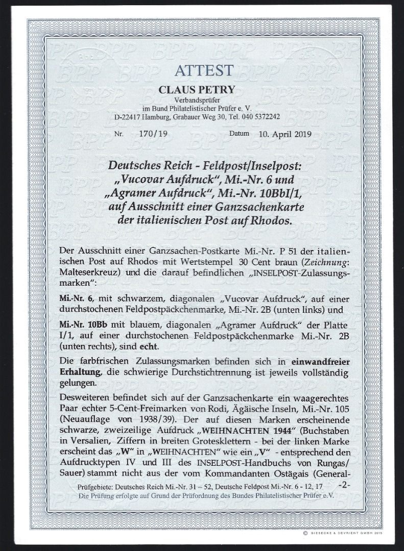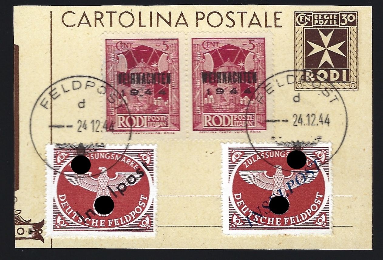 Zulassungsmarke Insel Rhodos, Mi. 12 im waagerechten Paar Type IV/III, Mi. 12 sowie 10 BbI 1, auf Ganzsachenausschnitt, mit Gefälligkeitstempel vom 24.12.1944 in einwandfreier Qualität mit ausführlichem Fotoattest Petry BPP, ME 2.970 €.