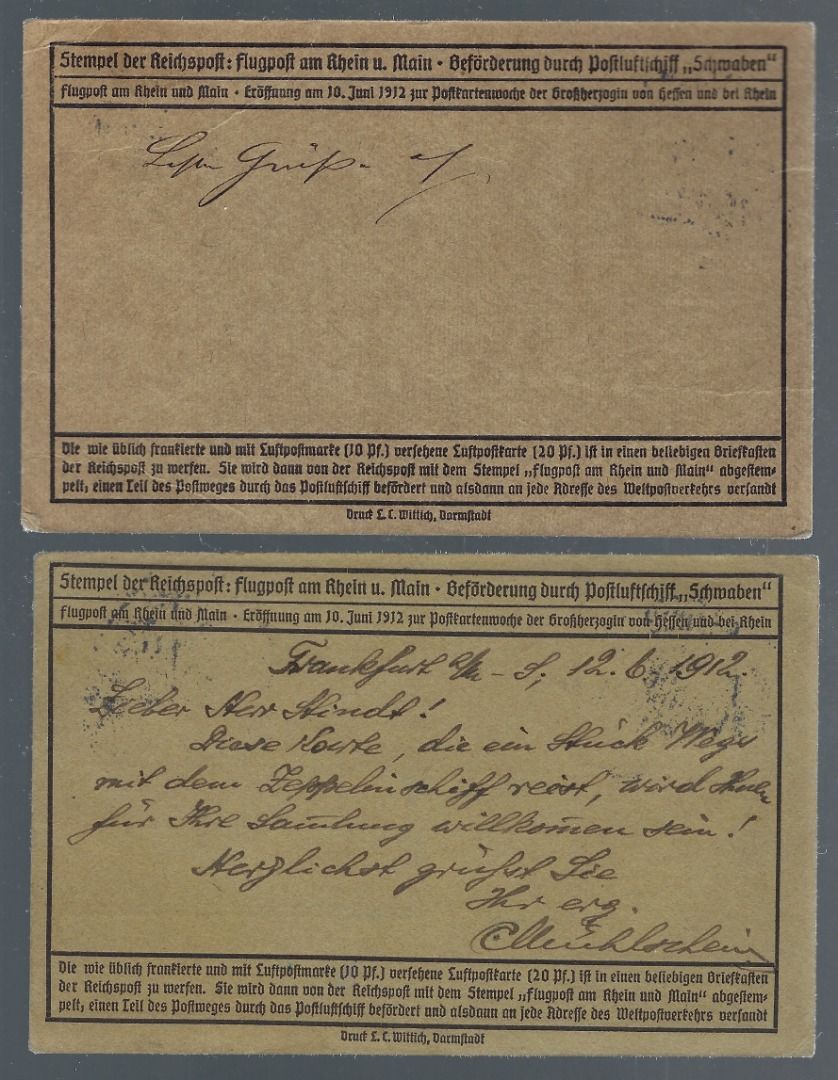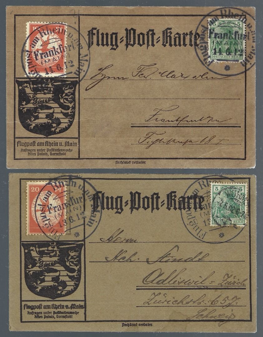 DR Flugpost 1912, Mi I und II jeweils auf Flugpostkarte nach Frankfurt und Zürich