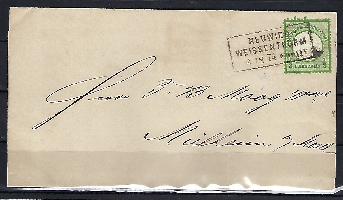 DR Mi 17b in sehr kräftigem dunkegrünoliv als EF mit klarem Ra3 Neuwied-Weissenthurm, Absender die damalige Rheinische Traubenzucker-Fabrik, befördert nach Mühlheim-Mosel. Toller beleg !