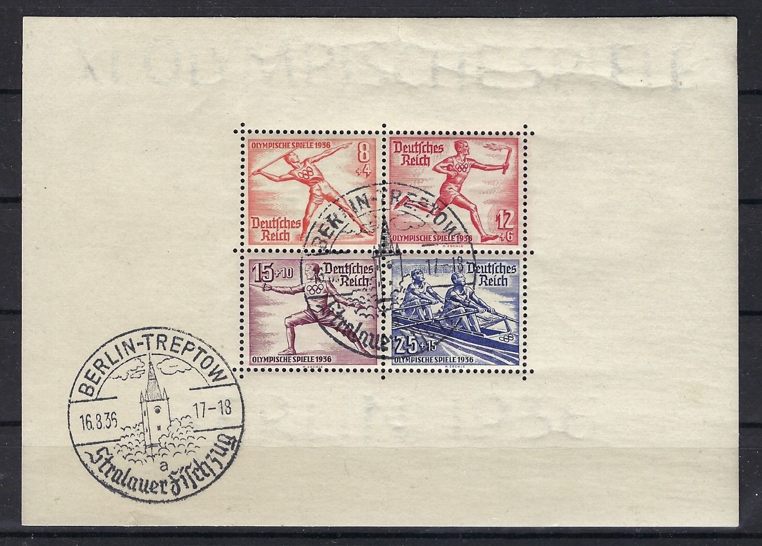 DR Olympiade 1936, Block 6 X SoSt „Berlin-Treptow“, auf Olympia Blocks nicht häufig