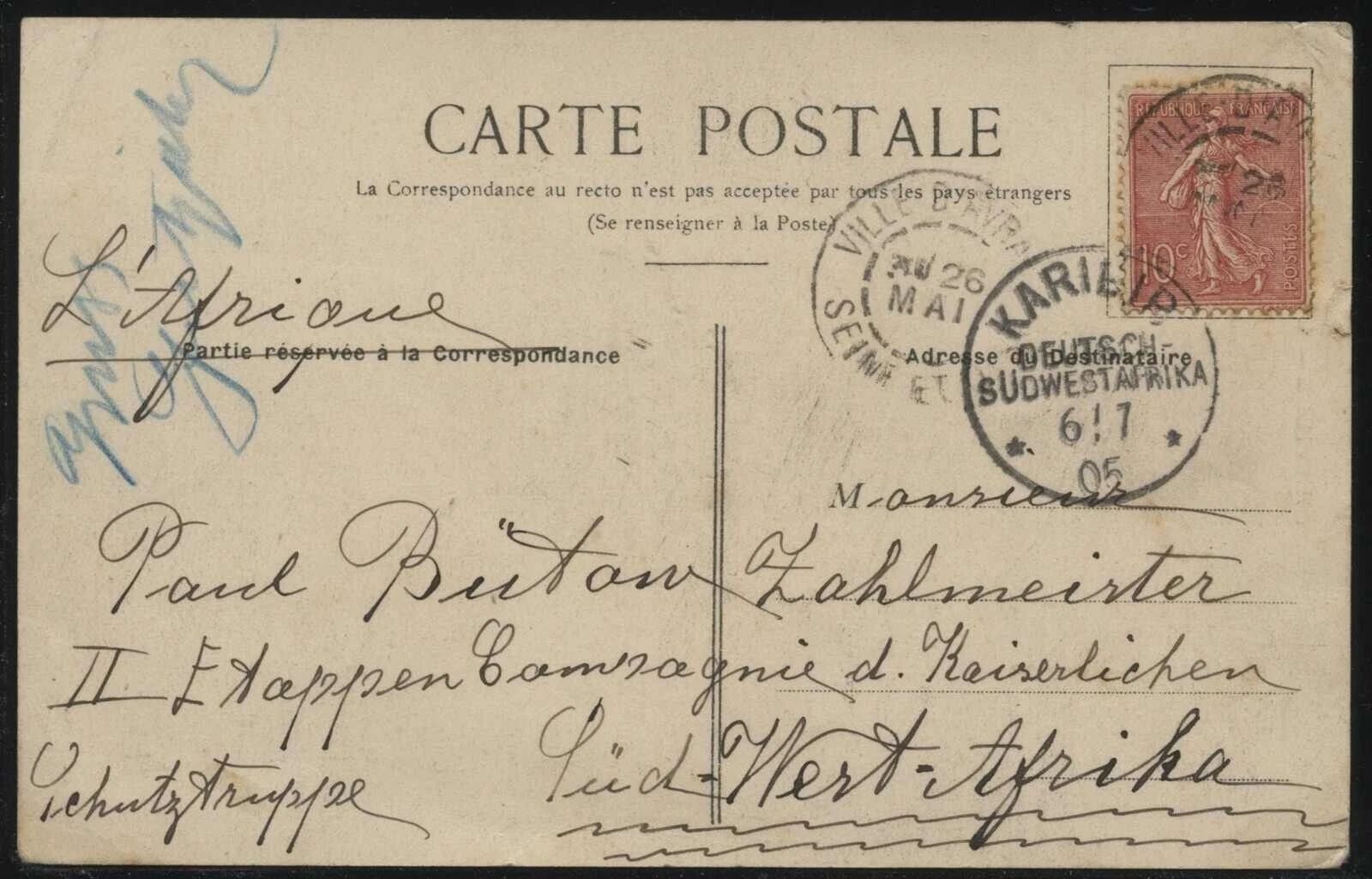 DSWA, AK Frankreich n Karibib an Paul Bütow Schutztruppen-Zahlmeister