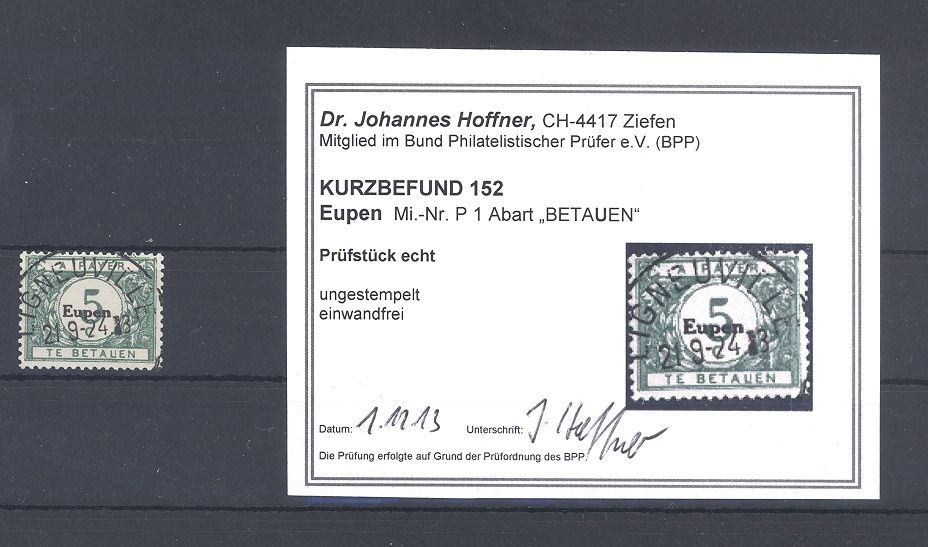 Deutsche Abstimmungsgebiete Eupen Michel Nummer P 1 mit dem Plattenfehler 1 gestempelt mit tollem Stempel. Es lieg ein Kurzbefund BPP vor, der Michel beträgt nur -,-