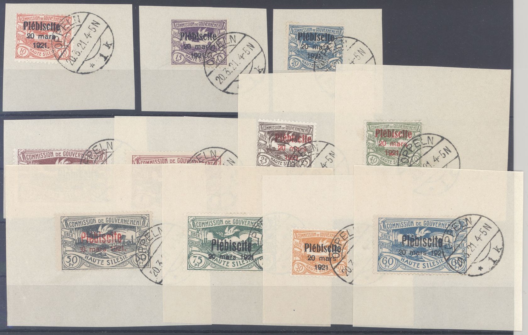 Deutsche Abstimmungsgebiete Oberschlesien Michel Nummer 30/40, Freimarken 1921 auf schönen Briefstücken. Jeder Wert ist geprüft BPP, ein echter Hingucker!