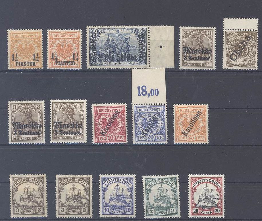 Deutsche Auslandpost und Kolonien, netter kleinerer */** Posten auf Steckkarte, dabei auch Türkei mit Chance auf verschiedene Farben und eine ganze Reihe an ** Werten wie 3 Pfg. China mit Zwischenstegansatz, Karolinen 4 II vom Oberrand,..