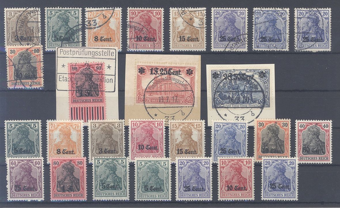 Deutsche Besetzung 1. WK Etappengebiet West Michel Nummer 1/12 weit überkomplett */gestempelt, meist gestempelt mit auch drei schönen Briefstücken, diese werten bereits mit 100,00 Euro