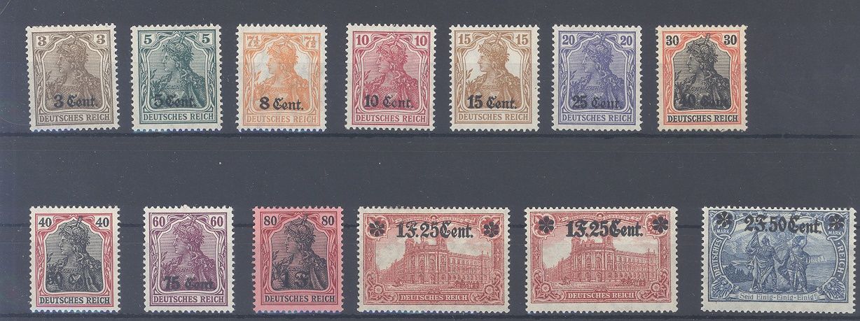 Deutsche Besetzung 1. WK Etappengebiet West Michel Nummer 1/12, Freimarken 1916 */**, dabei auch ** Werte wie aus die Michel 12 und die Michel Nummer 11 ist in beiden Typen vorhanden. Stets billigste Varianten gerechnet.