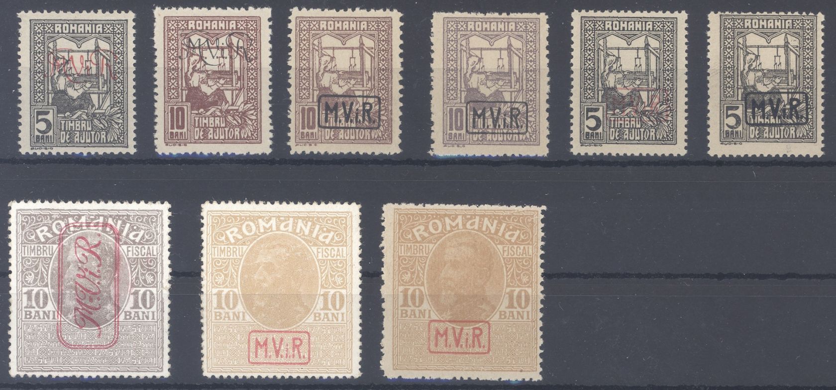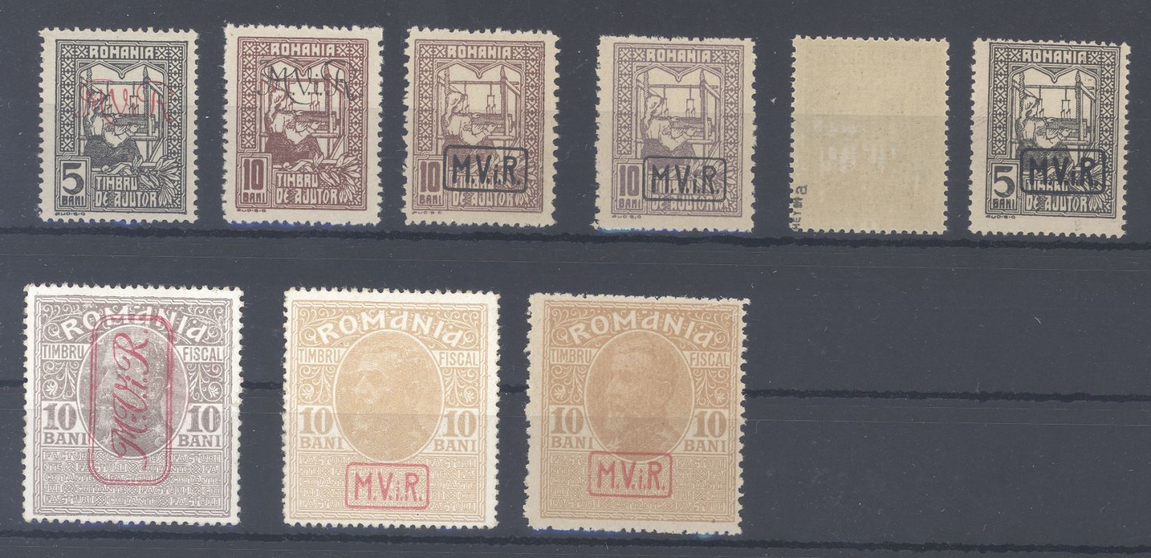 Deutsche Besetzung 1. WK Rumänien Kriegssteuermarken Michel Nummer1/7 **/*, überwiegend **. Die Michel Nummern 5 und 7 sind in beiden Farben bzw. Varianten vorhanden.