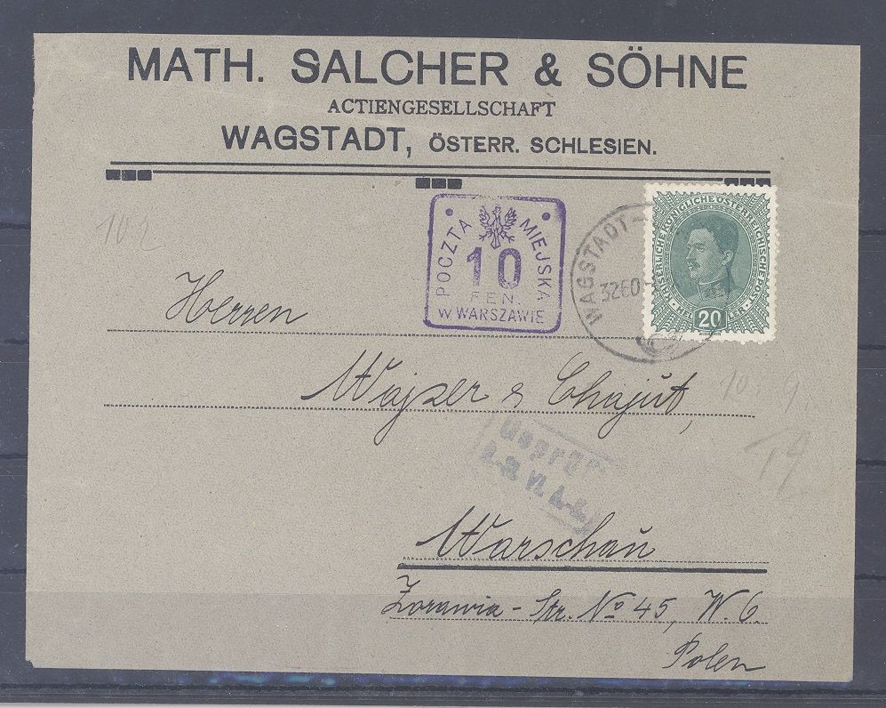 Deutsche Besetzung 1. WK Stadtpost Warschau, sehr interessanter Firmen Zensurbrief aus Wien gelaufen mit einem Eckbug, sonst ordentlich. Tolle Ergänzung zur Sammlung!