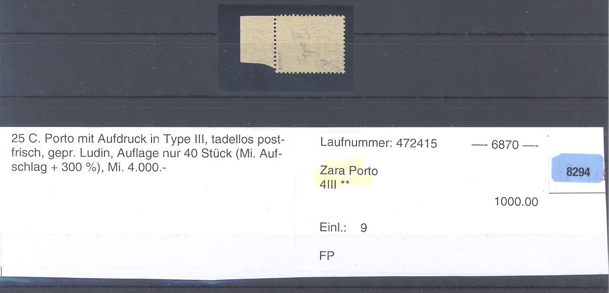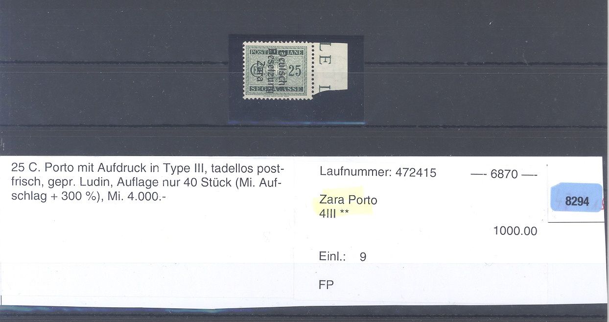 Deutsche Besetzung 2. WK Zara Porto Michel Nummer 4 III, die 25 C. Freimarke 1943 in der guten Type III **. Der Wert ist geprüft BPP, war ein Auktionslos mit 1.000,00 Euro Ausruf zzgl. 20 % Aufgeld, Seltenheit!