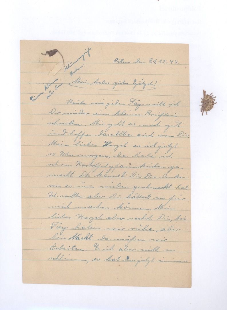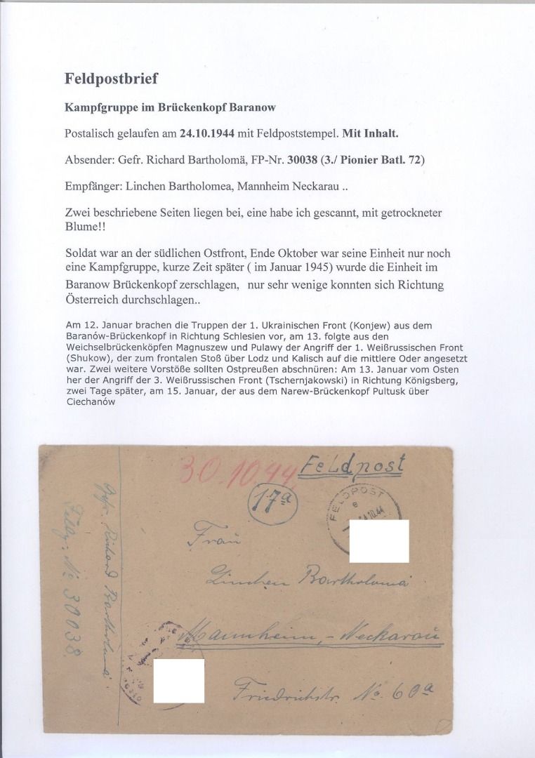 Deutsche Feldpost 2. WK, sauberer Brief mi Inhalt vom 24.10.1944 der Kampfgruppe im Brückenkopf Baranow mit der Feldpost Nummer 30038. Damit auch noch kleine Teile von getrockneten Blümchen...