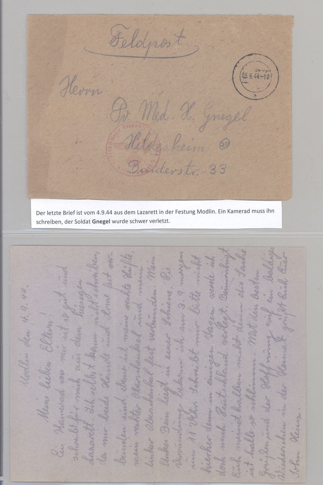 Deutsche Feldpost 2. WK, interessanter Brief mit Inhalt vom 9.9.1944 aus dem Lazarett in der Festung Modlin.