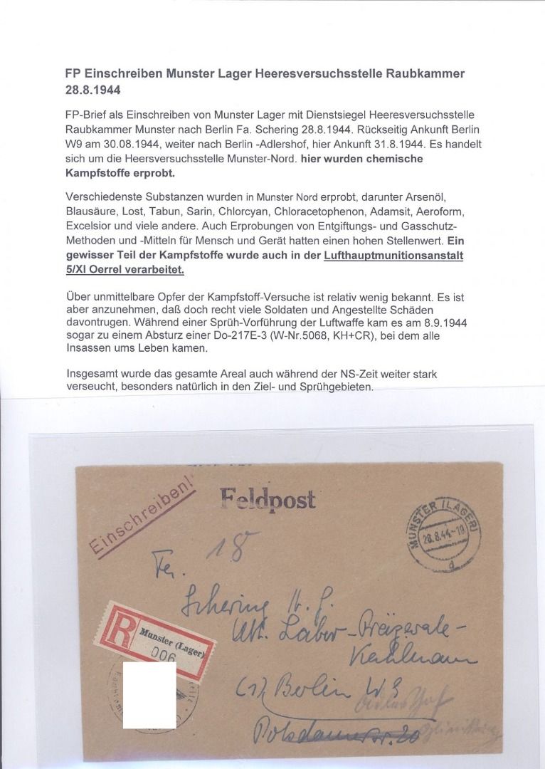 Deutsche Feldpost 2. WK, sauberer Einschreib - Brief ohne Inhalt vom 28.81944 aus Munster Lager mit Dienstsiegel Heeresversuchsstelle.