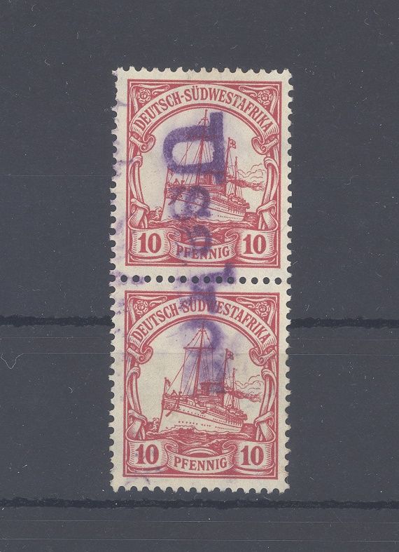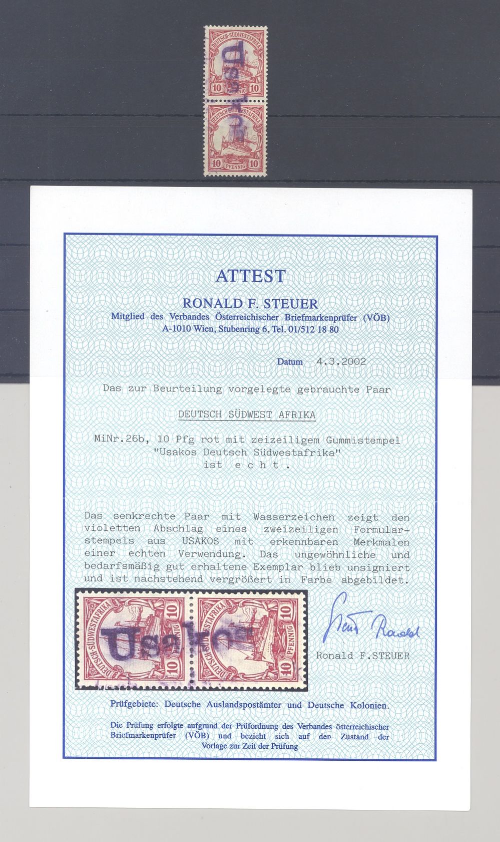 Deutsche Kolonien Deutsch - Südwestafrika, 10 Pfg. Freimarke im Paar mit gutem violettem Stempel aus Usakos. Es liegt ein Befund Steuer vor, ist mit eingescannt, sehr schöne Ergänzung zur Sammlung!