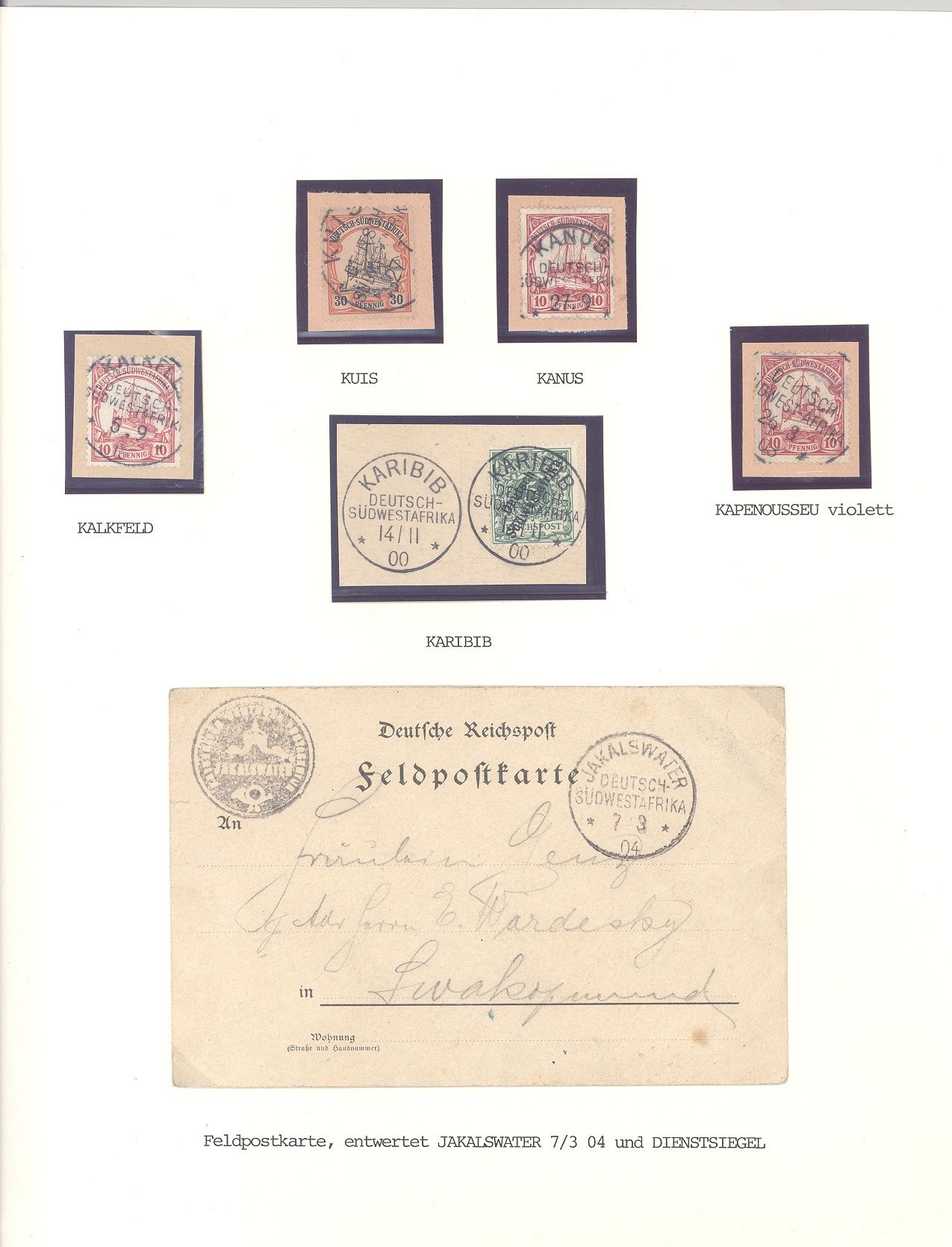 Deutsche Kolonien Deutsch Südwestafrika, interessantes Blatt mit schönen Stempeln und einer Karte. Tolle Ergänzung zur Sammlung!