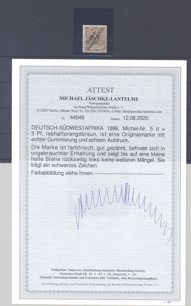 Deutsche Kolonien Deutsch Südwestafrika Michel Nummer 5d, 3 Pfg. 1899 in der guten Farbe d ungebraucht * mit einer kleinen hellen Stelle rückseitig, sonst ein schöner Wert. Es liegt ein FA BPP vor, hat bereits einiges gekostet, ist mit eingescannt.
