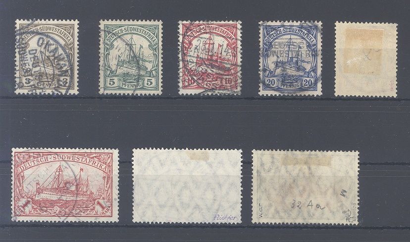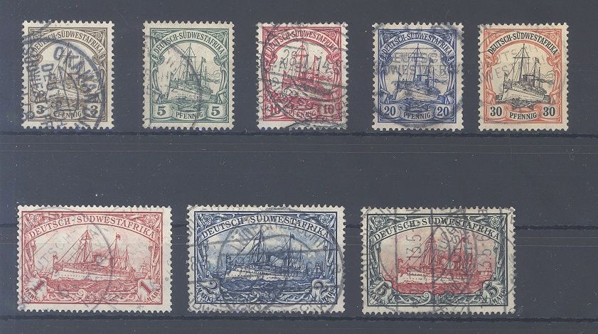 Deutsche Kolonien Deutsch Südwestafrika Michel Nummer 24/32, Freimarken 1906 gestempelt, drei Werte sind geprüft.