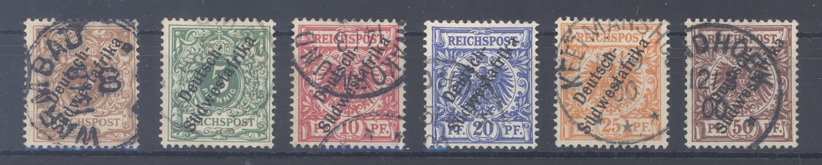 Deutsche Kolonien Deutsch Südwestafrika Michel Nummer 5/10, Freimarken 1898 gestempelt. Die Michel Nummern 1 und der Hauptwert Michel Nummer 9 sind geprüft.
