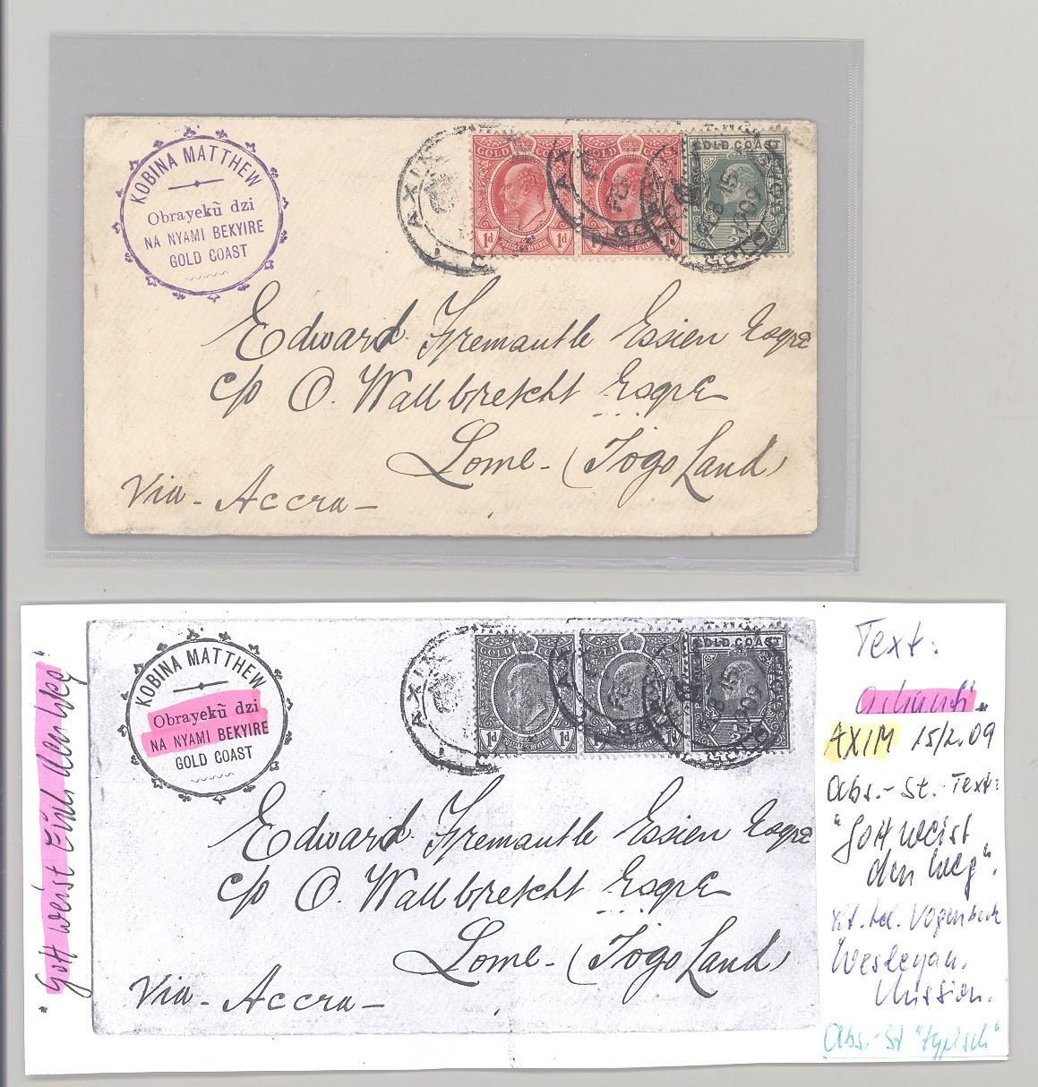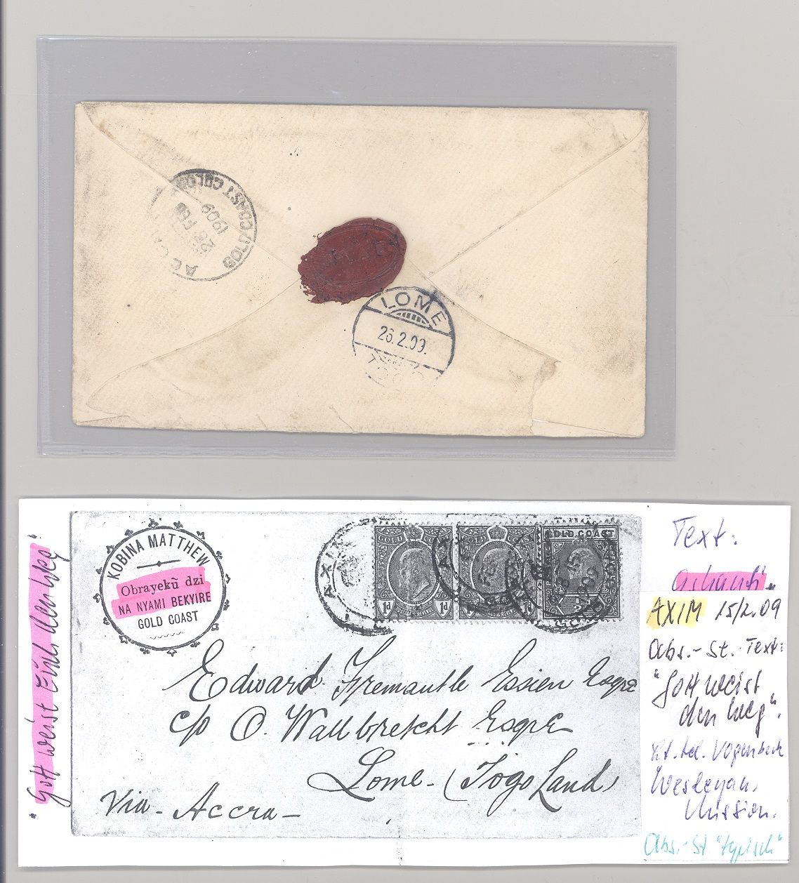 Deutsche Kolonien bzw. Goldküste, sehr interessanter Brief aus dem Jahr 1909 aus Quittah nach Lome / Togo gelaufen. Tolle Ergänzung zur Sammlung!