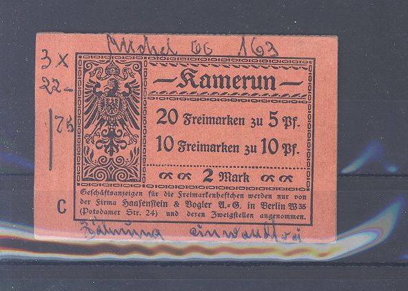 Deutsche Kolonien Kamerun Markenheftchen MH 3 ** mit Beschriftung vorderseitig sonst ordentlich. Der Michel passt hier nicht, selten einmal angeboten!
