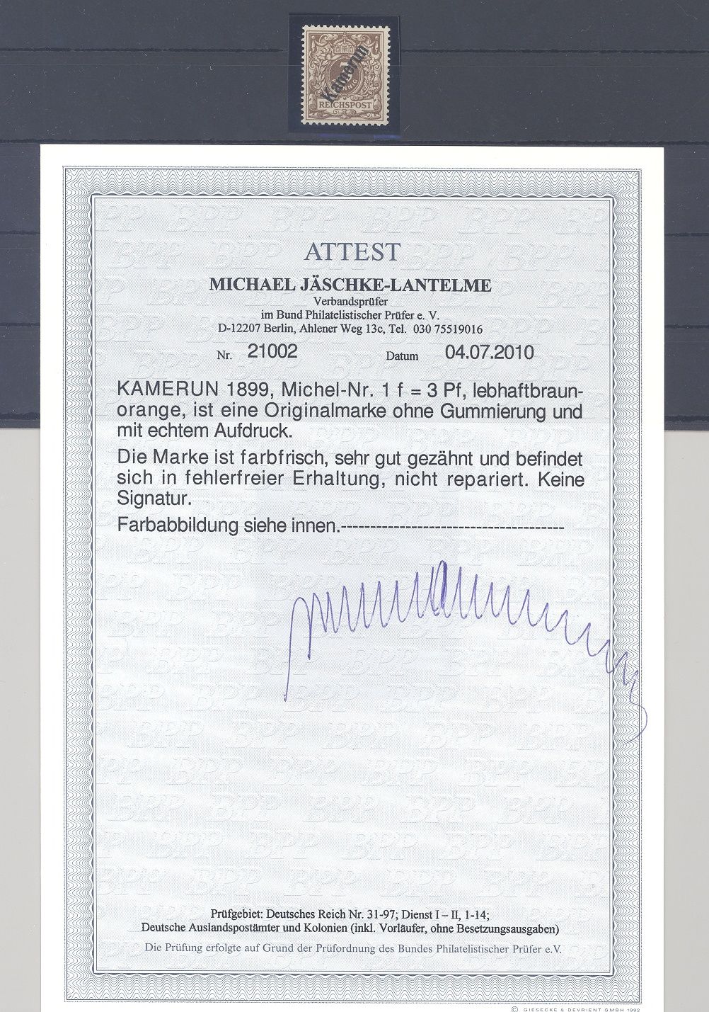 Deutsche Kolonien Kamerun Michel Nummer 1f, 3 Pfg. Freimarke 1897/99 in der guten Farbe f ungebraucht (*), ein schöner Wert. Der Michel für ungebraucht * beträgt 900,00 Euro, es liegt ein FA BPP vor, hat bereits einiges gekostet, ist mit eingescannt.