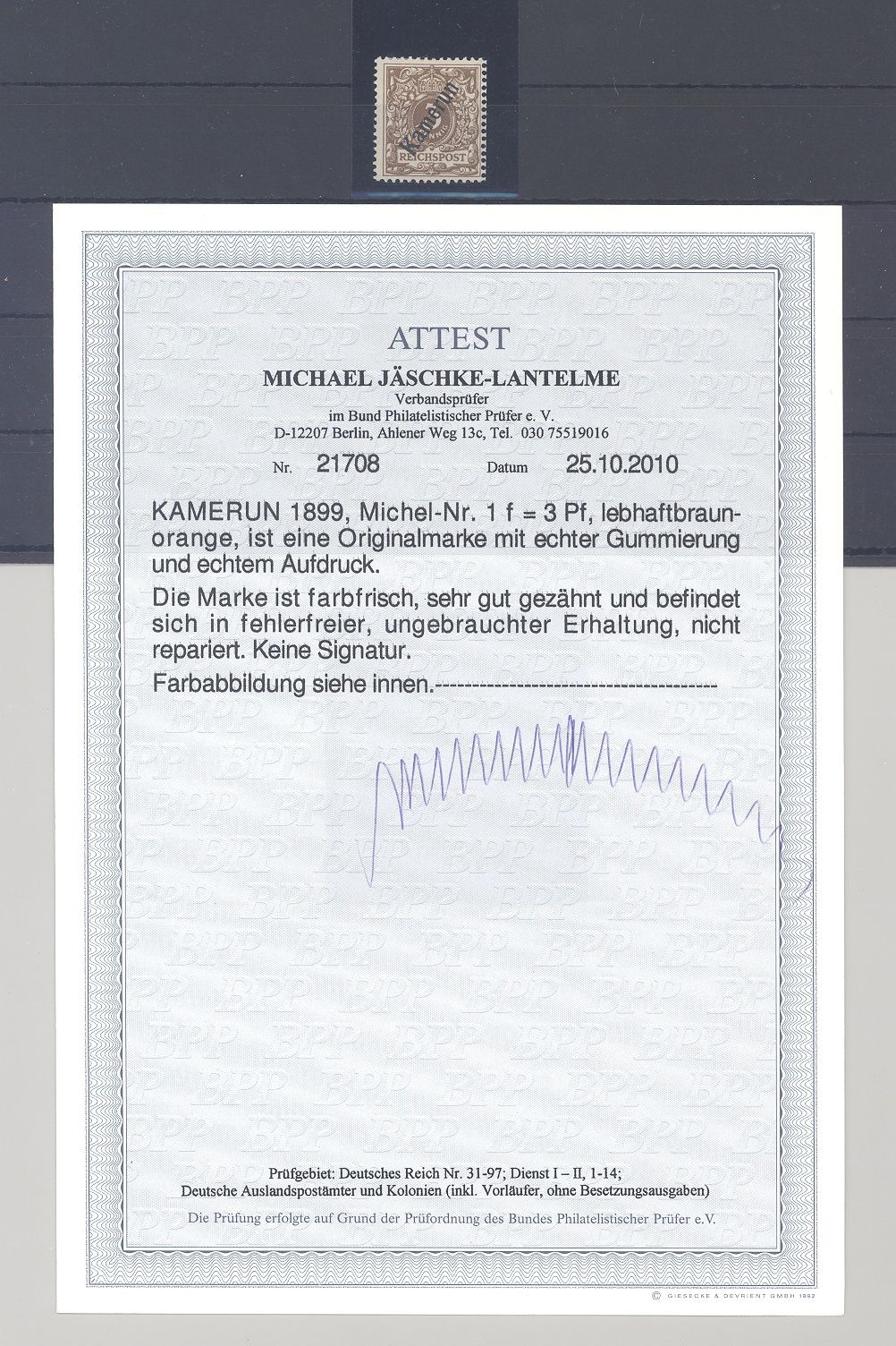 Deutsche Kolonien Kamerun Michel Nummer 1f, 3 Pfg. Freimarke 1897/99 in der guten Farbe f ungebraucht *. ein schöner Wert. Es liegt ein FA BPP vor, hat bereits einiges gekostet, ist mit eingescannt.