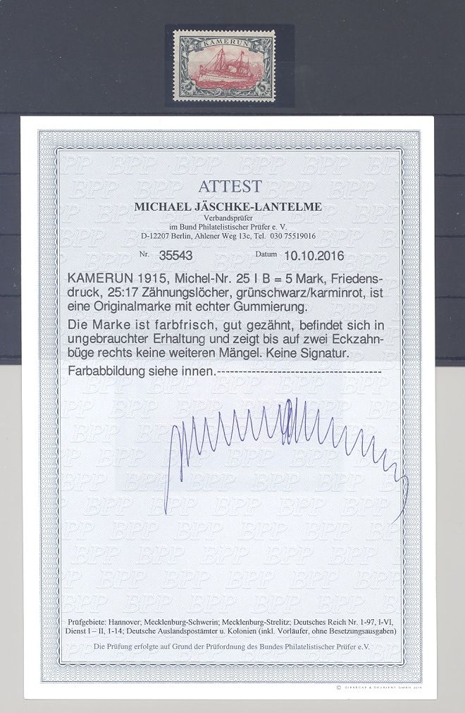 Deutsche Kolonien Kamerun Michel Nummer 25 I B, 5 Mark Freimarke 1905/19 in der guten Variante I B ungebraucht * mit einer etwas runden Ecke, sonst ein schöner Wert. Es liegt ein FA BPP vor, hat bereits einiges gekostet, ist mit eingescannt.