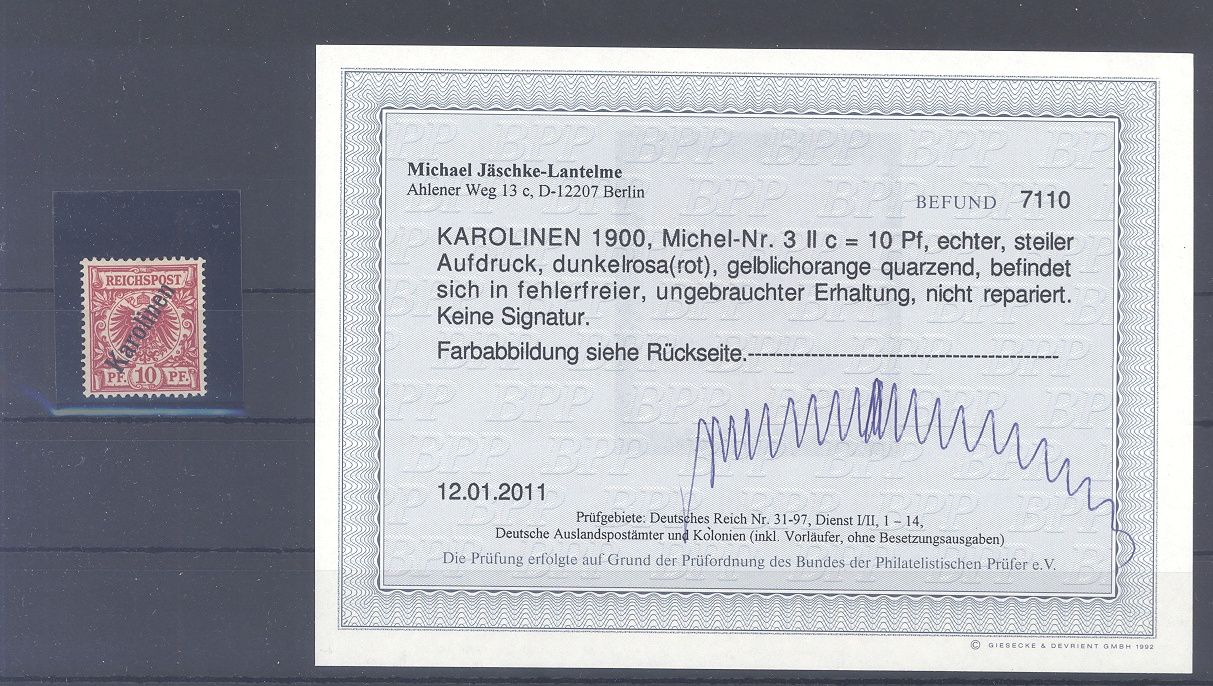 Deutsche Kolonien Karolinen Michel Nummer 3 II c , 10 Pfg. Freimarke 1897/1899 in der besseren Farbe c ungebraucht *, ein schöner Wert. Es liegt ein Befund BPP vor, hat bereits einiges gekostet, ist mit eingescannt.