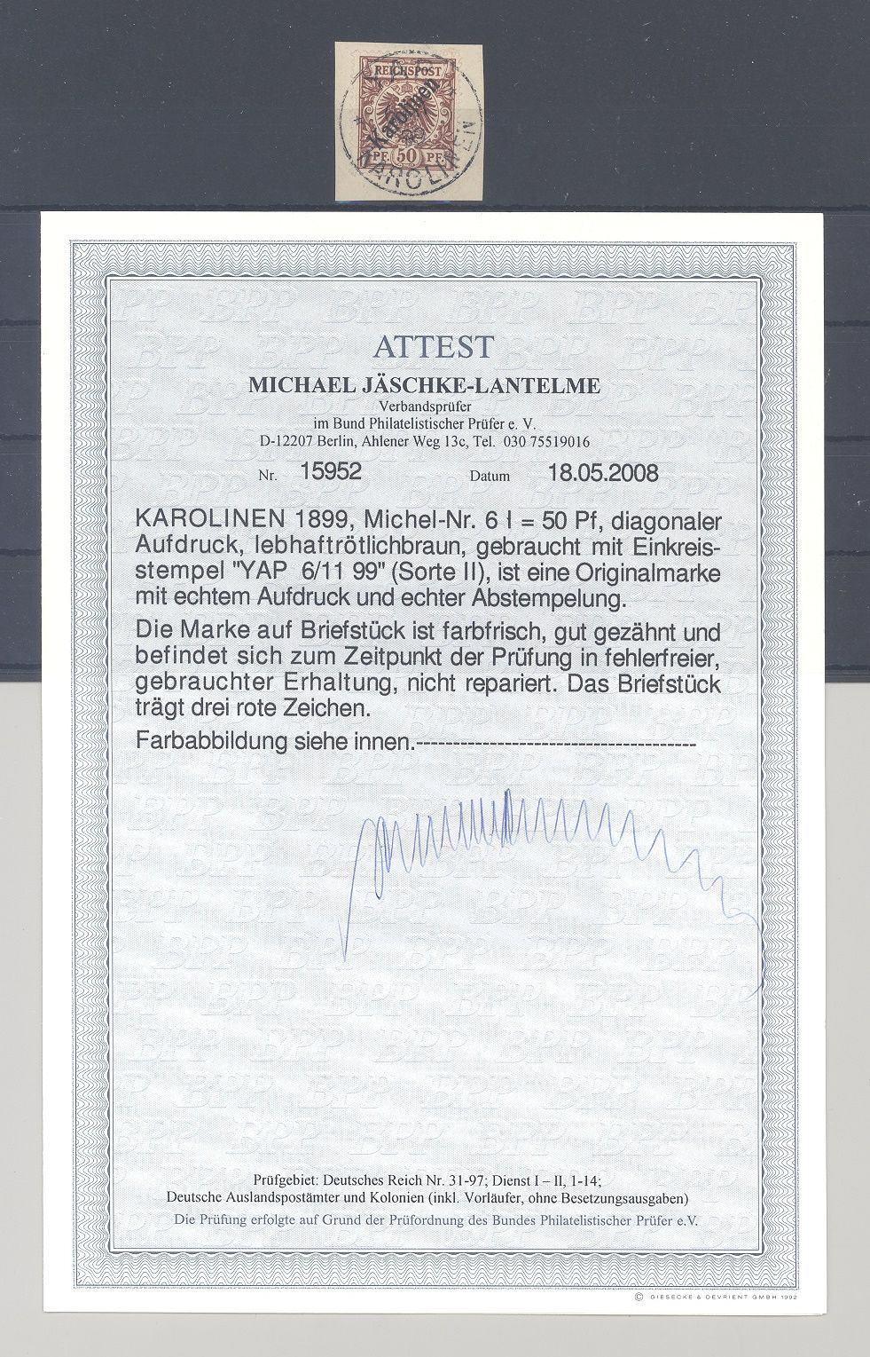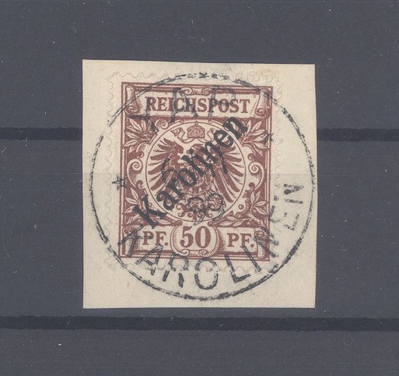 Deutsche Kolonien Karolinen Michel Nummer 6 I, 50 Pfg. Freimarke 1900 gestempelt auf sehr schönem Briefstück. Es liegt ein FA BPP vor, hat bereits einiges gekostet, ist mit eingescannt, toll!