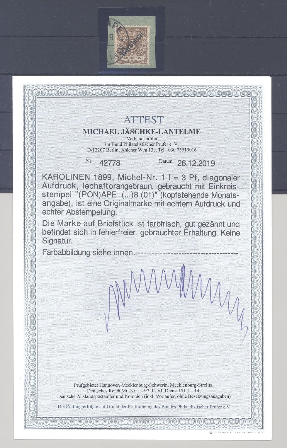 Deutsche Kolonien Karolinen Michel Nummer 1 I, 3 Pfg. Freimarke 1899/1900 gestempelt auf Briefstück, ein sehr ordentlicher Wert. Es liegt ein FA BPP vor, hat bereits einiges gekostet, ist mit eingescannt, selten einmal angeboten.
