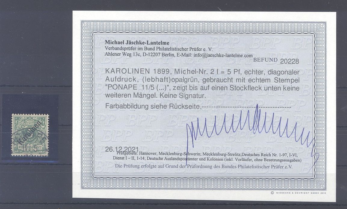 Deutsche Kolonien Karolinen Michel Nummer 2 I, 5 Pfg. Freimarke 1899/1900 mit einem kleinen Stockfleck unten, sonst ein ordentlicher Wert. Es liegt ein Befund BPP vor, ist mit eingescannt, hat bereits einiges gekostet.