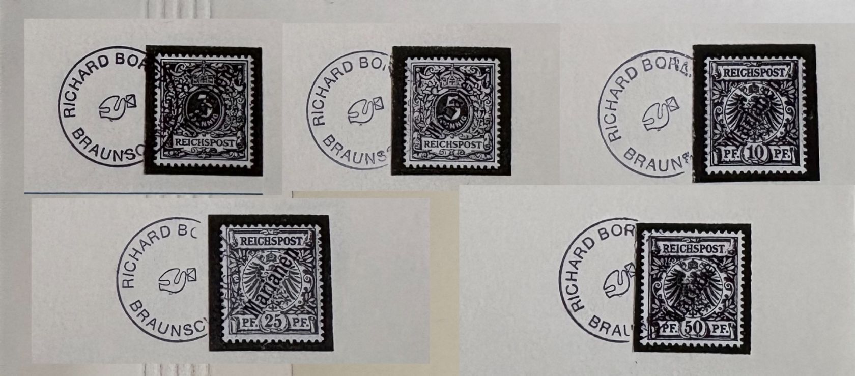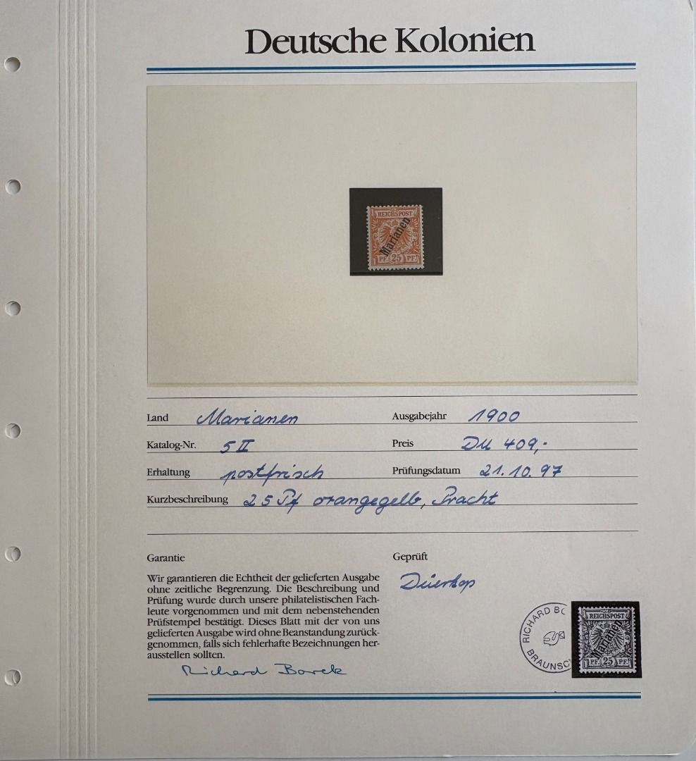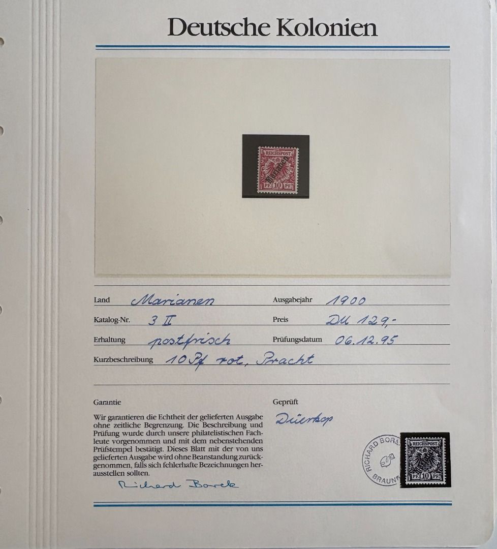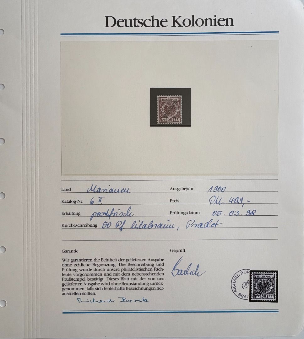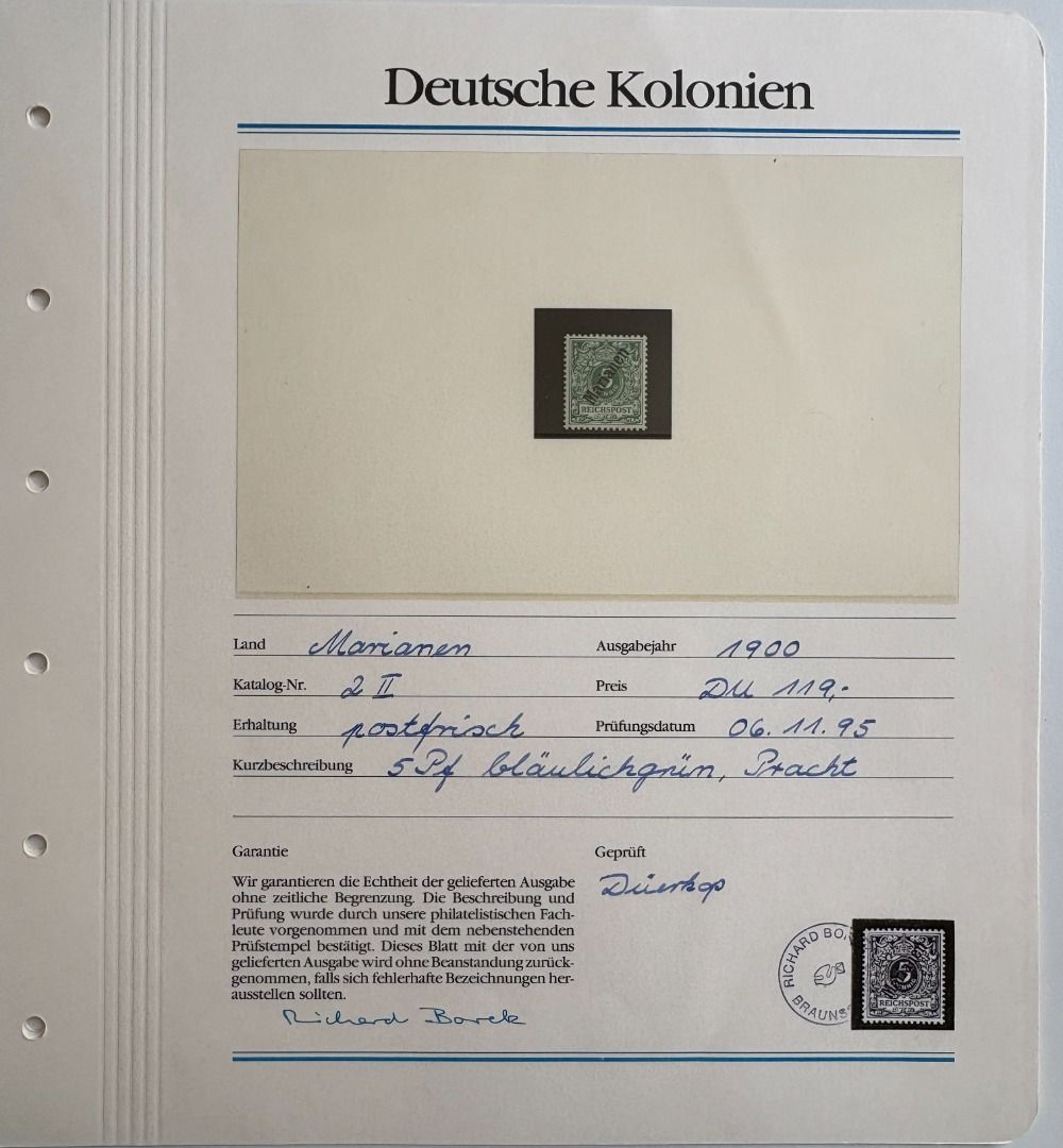 Deutsche Kolonien Marianen Michel Nummer 1/6 II, Freimarken 1900 fast komplett **, es fehlt nur die Michel Nummer 4. Die Marken stammen aus einem Abo, hatten mal 1155,00 DM gekostet, ein Blatt ist beispielhaft eingescannt.
