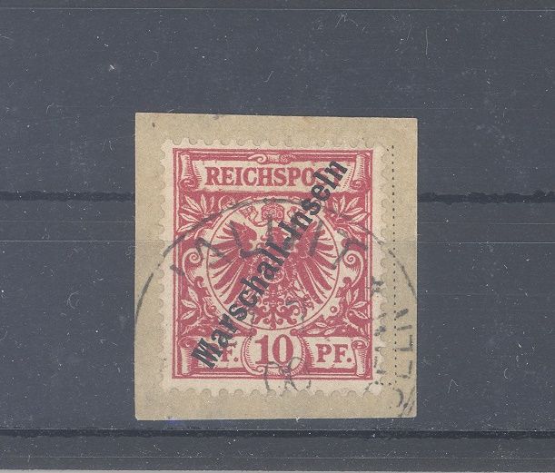 Deutsche Kolonien Marshall Inseln Michel Nummer 3 II, 10 Pfg. Freimarke 1899 gestempelt auf Briefstück mit der besseren 2. Sorte. Das Briefstück ist geprüft.