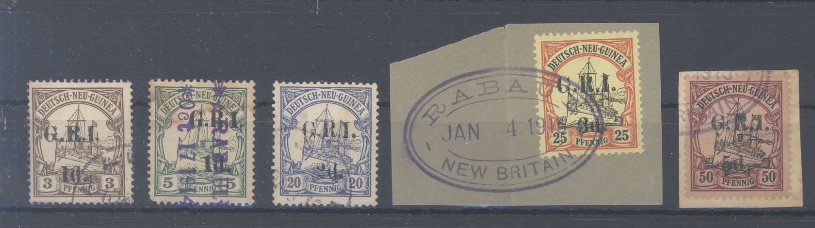 Deutsche Kolonien Neuguinea, fünf verschiedene gestempelte G.R.I Ausgaben in etwas unterschiedlicher, insgesamt doch ordentlicher Erhaltung, dabei aber auch zwei schöne Briefstücke. Billigste Typen gerechnet, der Michel passt hier nicht, selten einmal angeboten!