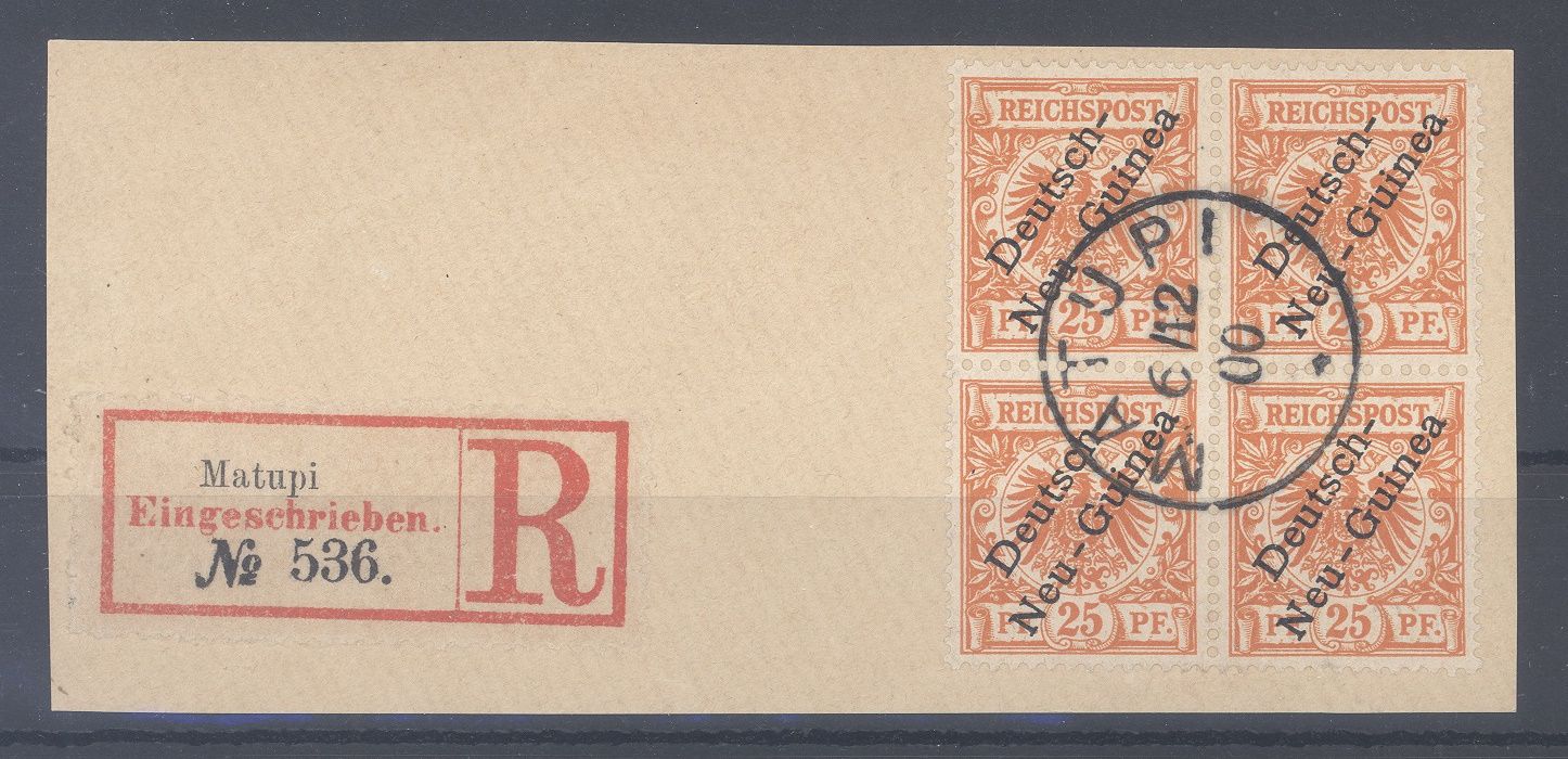 Deutsche Kolonien Neuguinea Michel Nummer 6, 25 Pfg. Freimarke 1897 als Viererblock auf traumhafem Briefstück. Ein echter Hingucker!