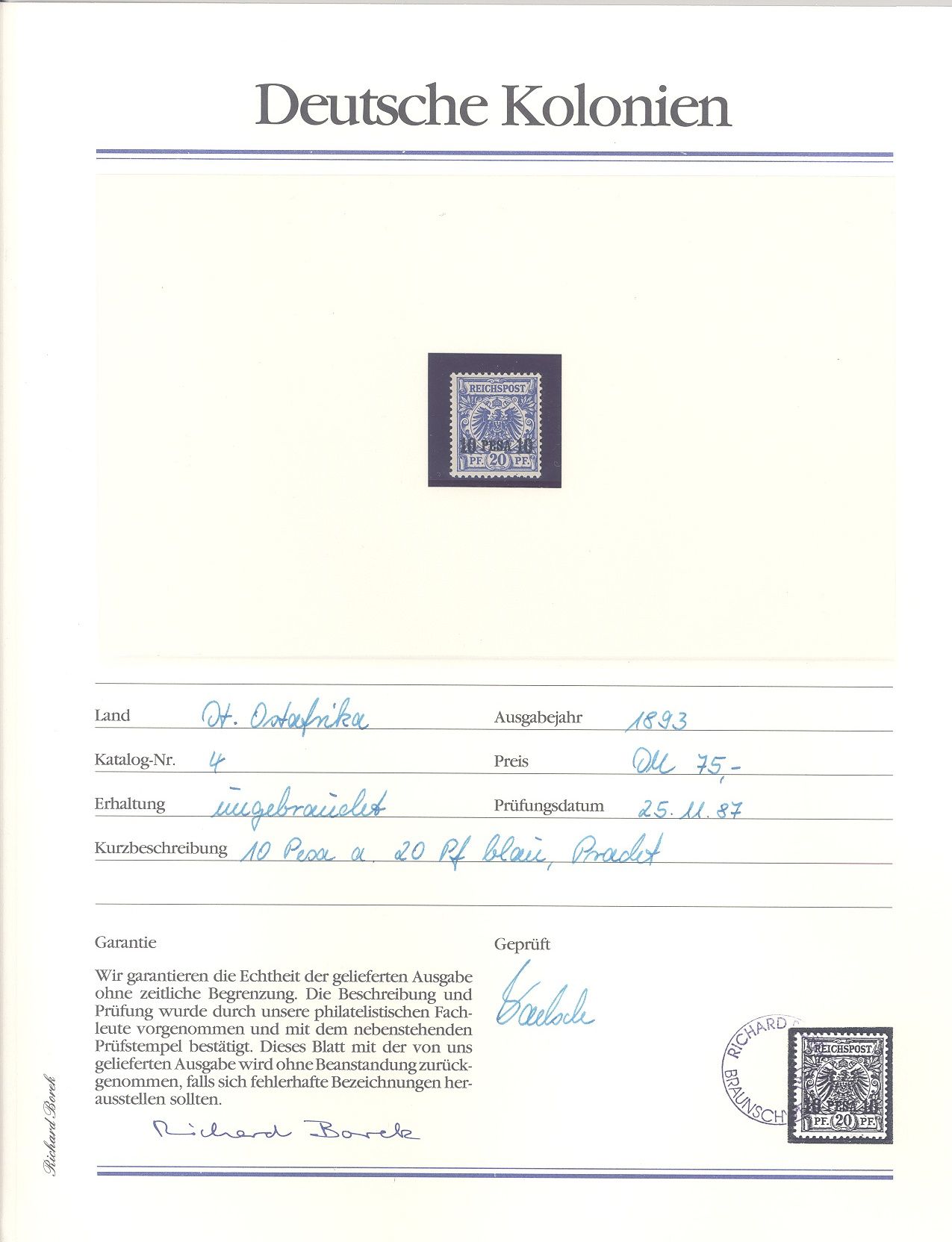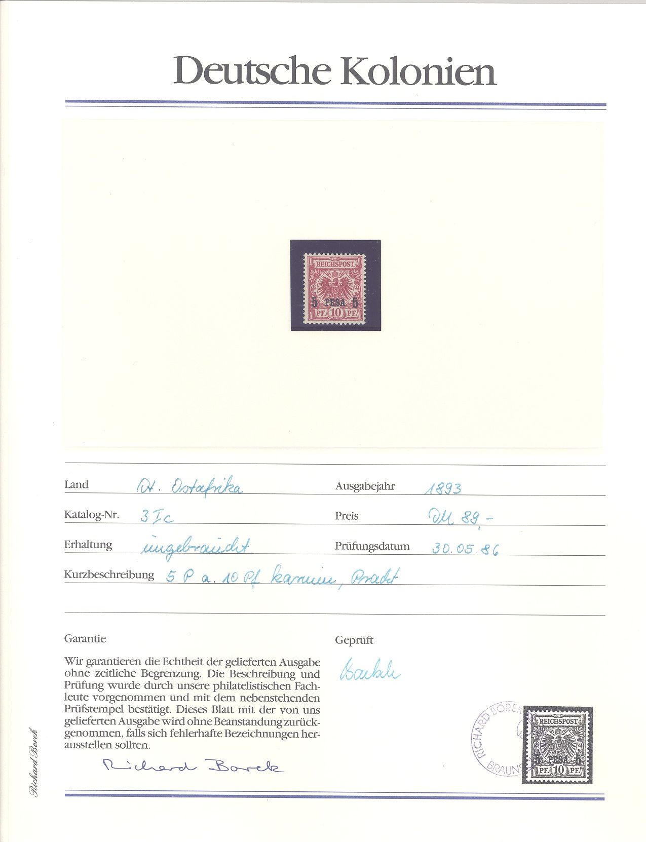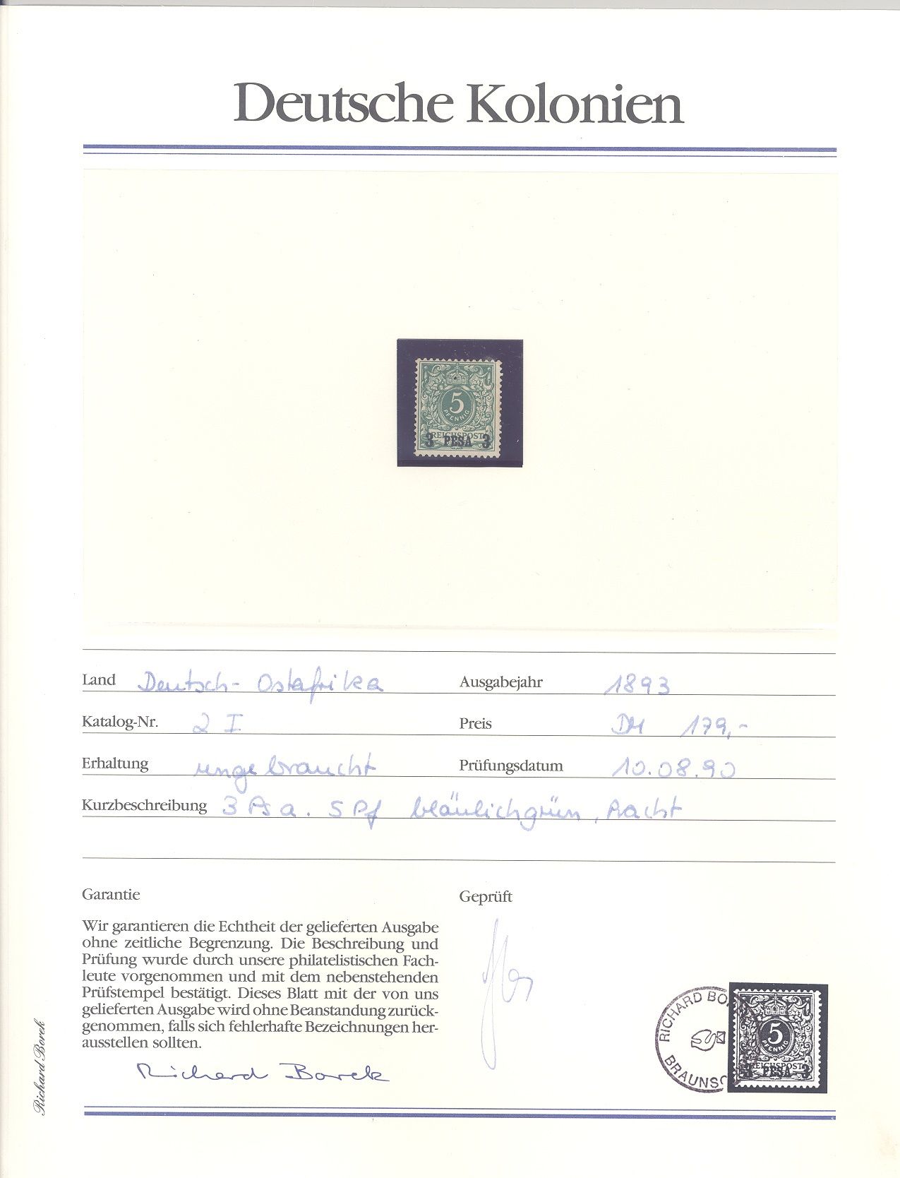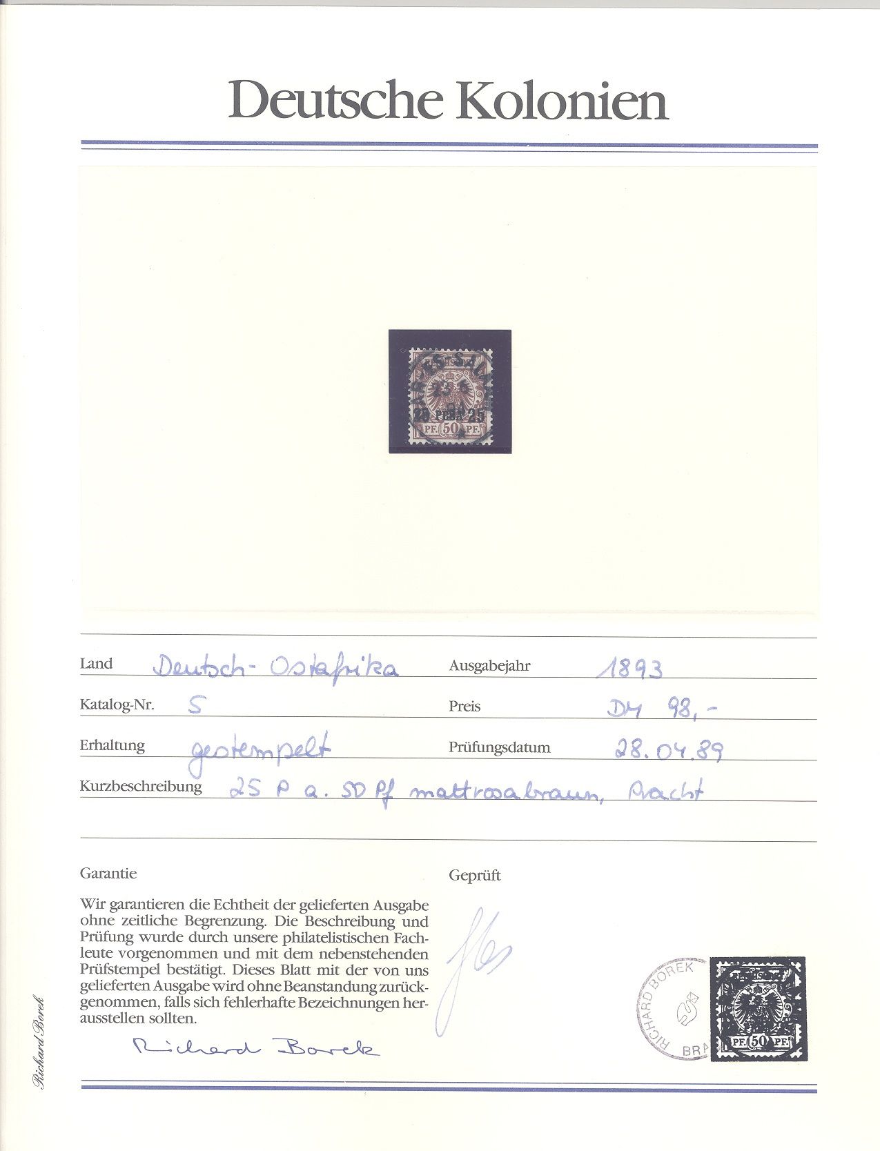 Deutsche Kolonien Ostafrika Michel Nummer 1/5, Freimarken 1893 */gestempelt, die Michel Nummer 5 ist gestempelt, die anderen Werte sind ungebraucht *. Aus Abo hatten damals 492 DM gekostet, ein Blatt ist beispielhaft eingescannt.