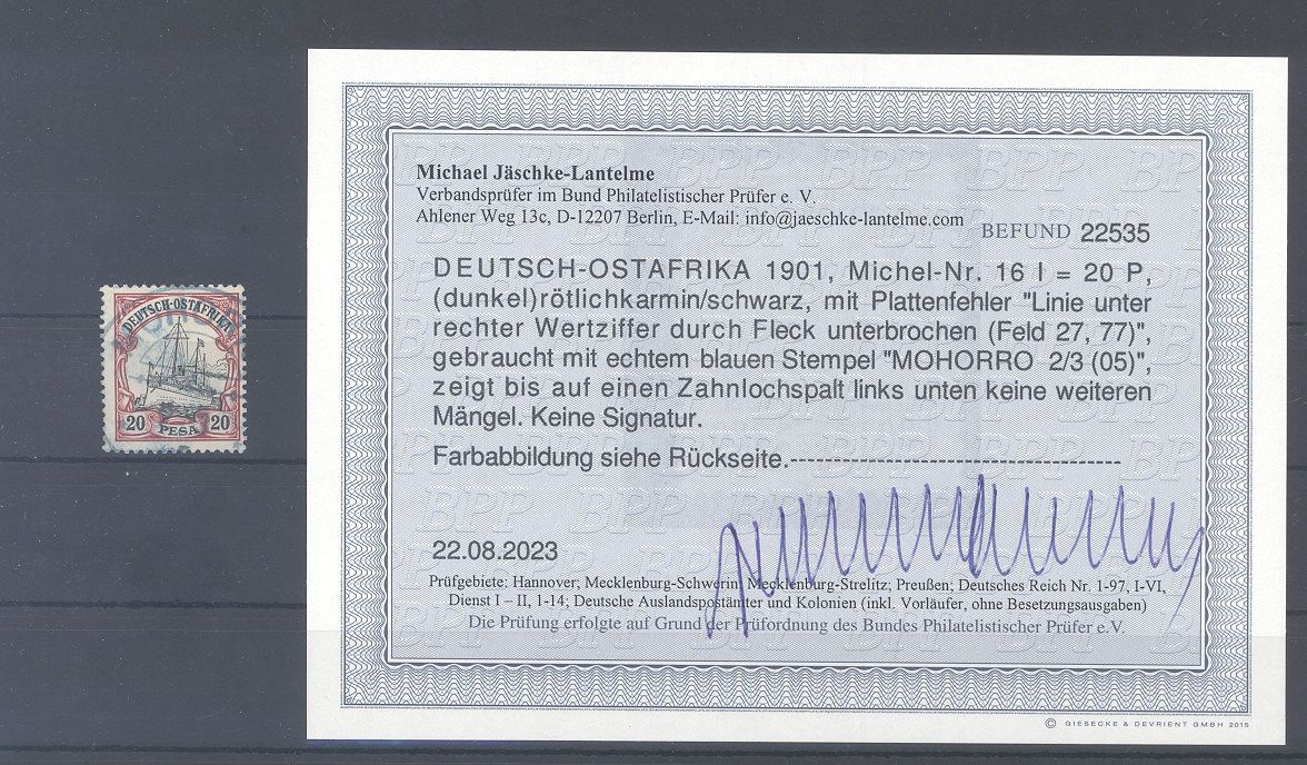 Deutsche Kolonien Ostafrika Michel Nummer 16 I, 20 Pesa Freimarke 1893 mit dem Plattenfehler I gestempelt, ein insgesamt sehr ordentlicher Wert. Es liegt ein Befund BPP vor, hat bereits einiges gekostet, ist mit eingescannt.