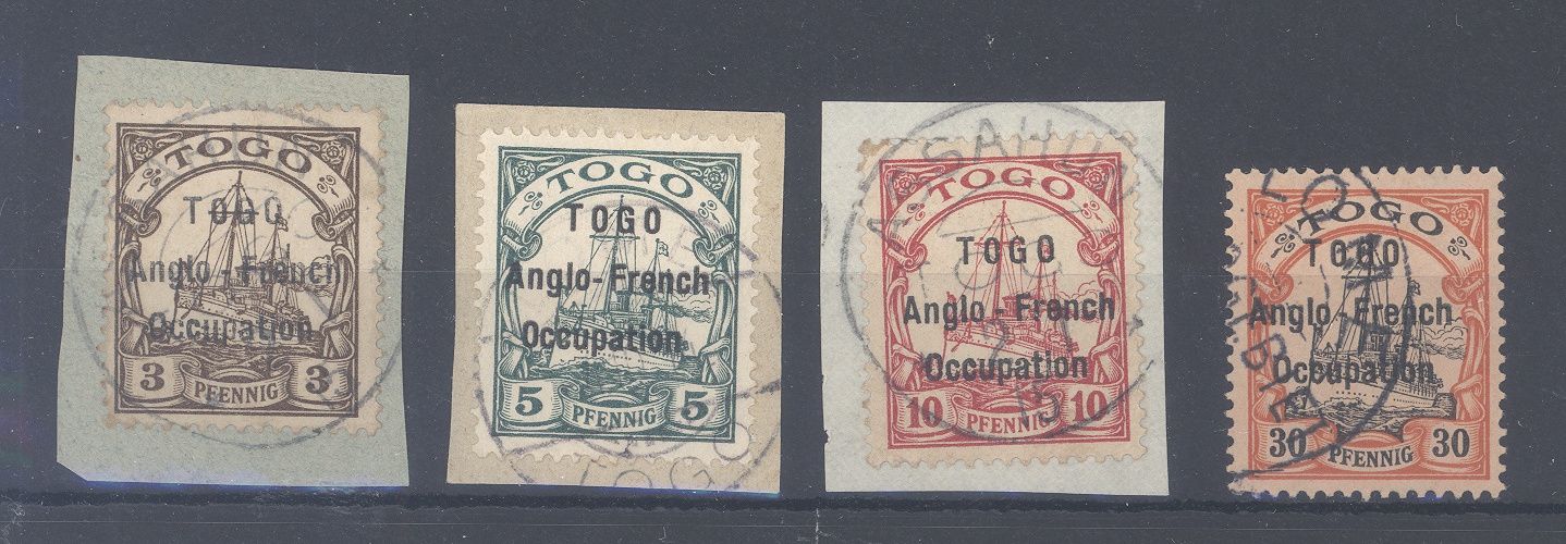 Deutsche Kolonien Togo Britische Besetzung, interessanter kleiner gestempelter Posten bestehend aus vier verschiedenen Werten, zwei Werte sind etwas stockig, aber meist sogar auf Briefstücken. Ein Wert ist geprüft, selten einmal angeboten.