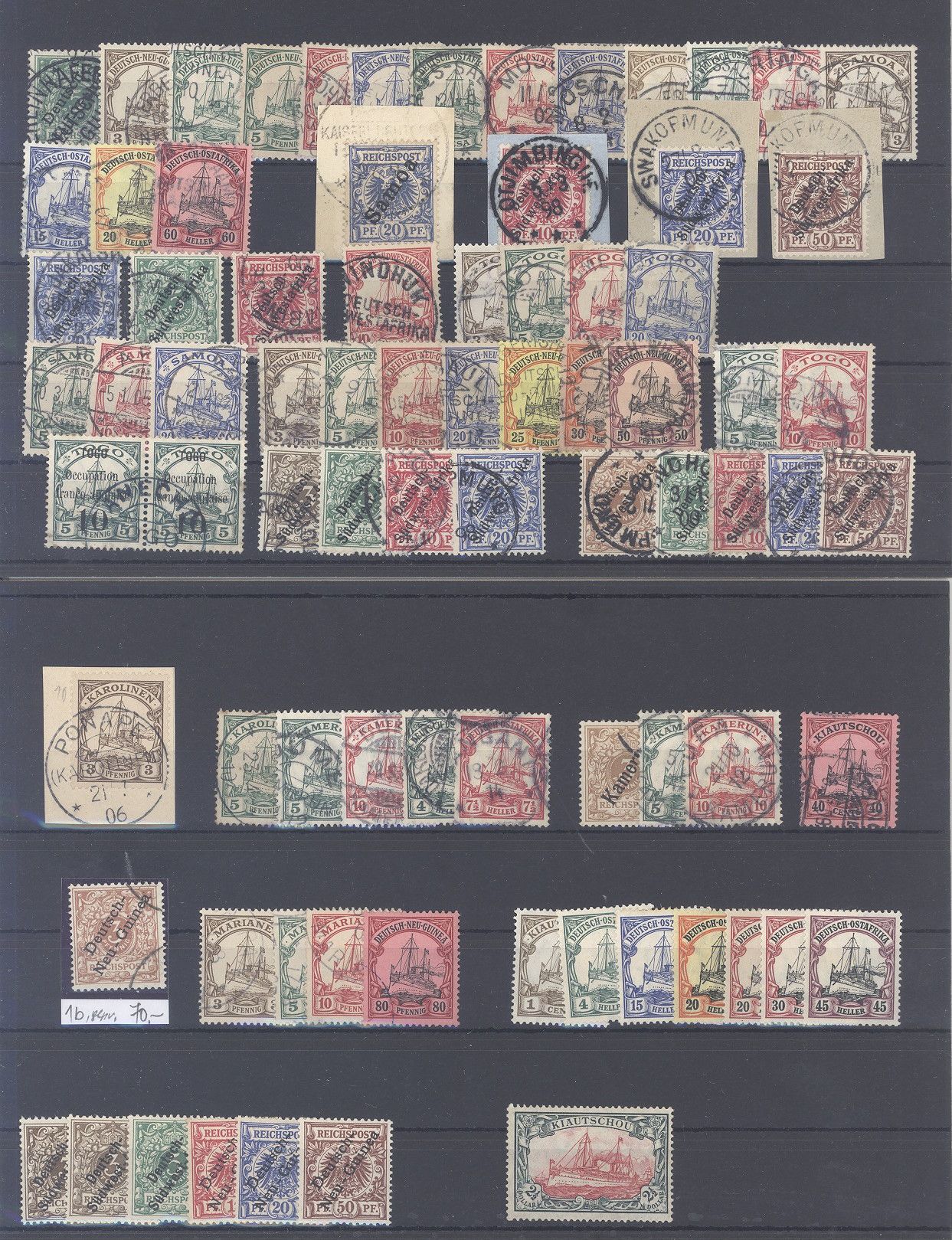Deutsche Kolonien, umfangreicher Posten */gestempelter Posten auf drei Steckkarten, einfach zusammengesteckt. Vollkommen unberechnet, sollte ein nettes Schnäppchen sein!