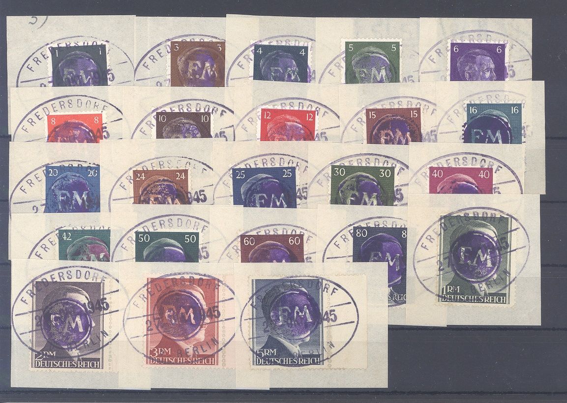Deutsche Lokalpost Fredersdorf Michel Nummer 1/23, Freimarken 1945 auf Briefstücke, jeder Wert ist signiert.