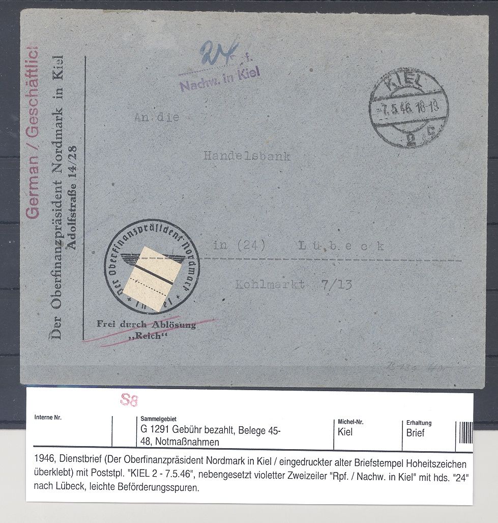 Deutsche Lokalpost Kiel, interessanter Dienstbrief vom 7.5.1946 mit Poststempel Kiel und Handstempel "24 Pfg. Nachw. in Kiel". Nette Ergänzung zur Sammlung.