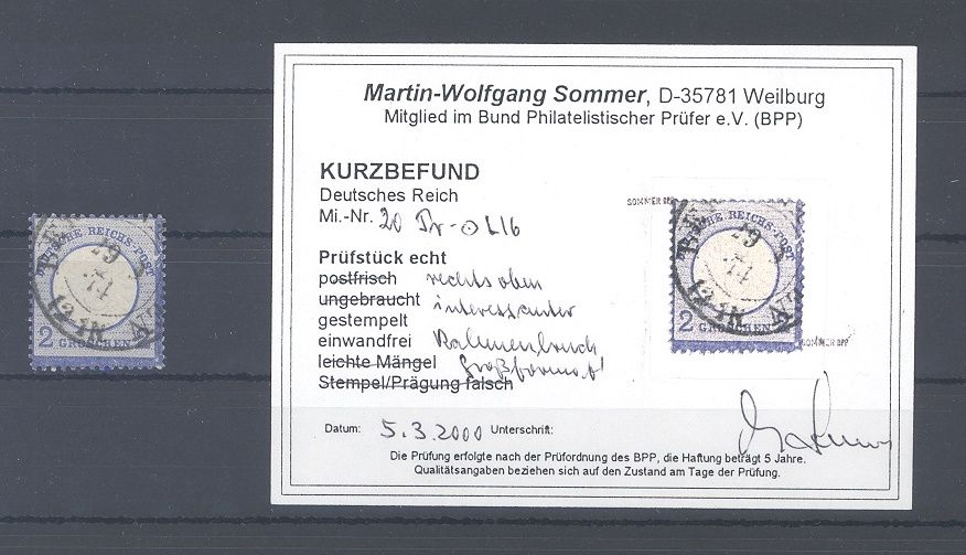 Deutsches Reich, 2 Groschen großes Brustschild mit einer wie auch im Befund erwähnt interessanten Besonderheit, Bruch im Rahmen, gestempelt. Es liegt ein Befund BPP vor, hat bereits einiges gekostet, ist mit eingescannt.