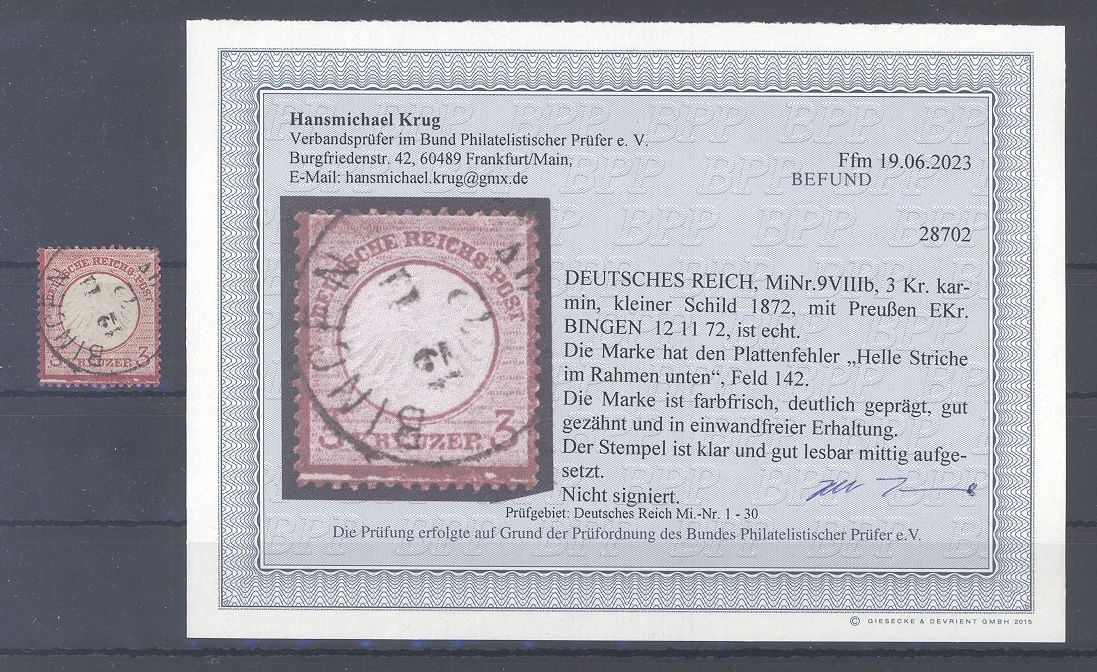 Deutsches Reich, 3 Kreuzer großes Brustschild mit dem seltenen Plattenfehler VIIIb gestempelt. Es liegt ein Befund BPP vor, hat bereits einiges gekostet, ist mit eingescannt.