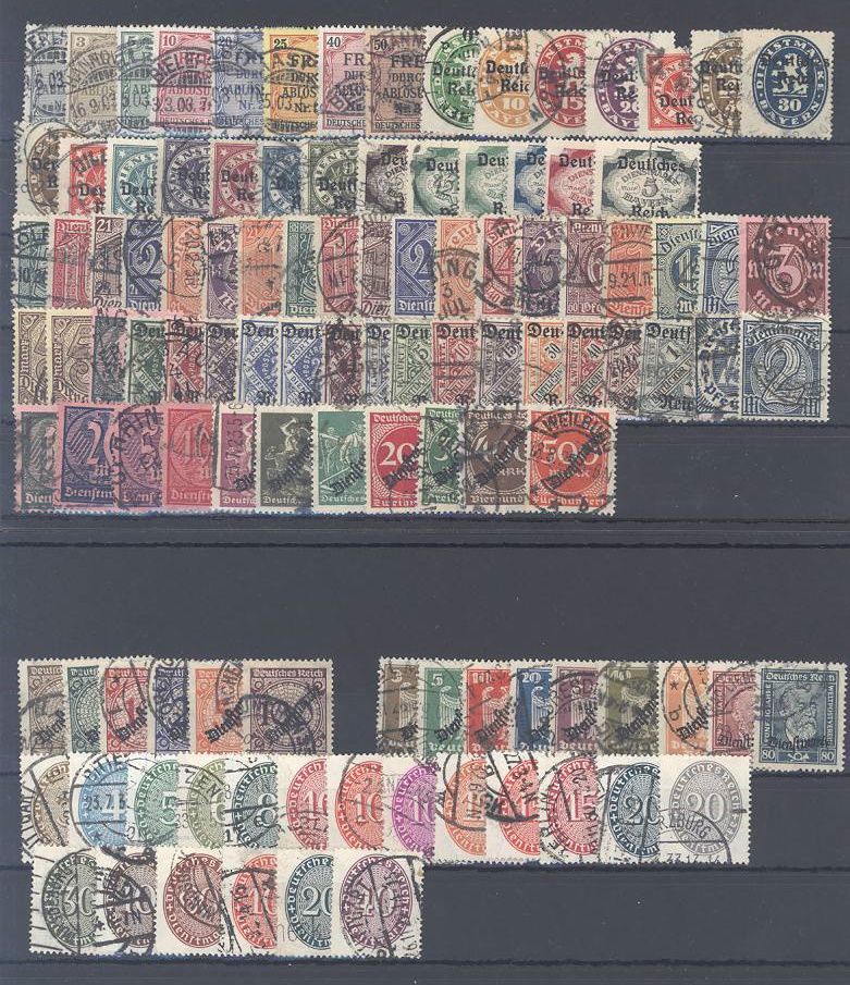 Deutsches Reich Dienst, umfangreiche gestempelter Posten auf zwei Steckkarten, einfach zusammengesteckt mit auch Mi.Nr. 16/56 und 99/131. Sollte ein nettes Schnäppchen sein...